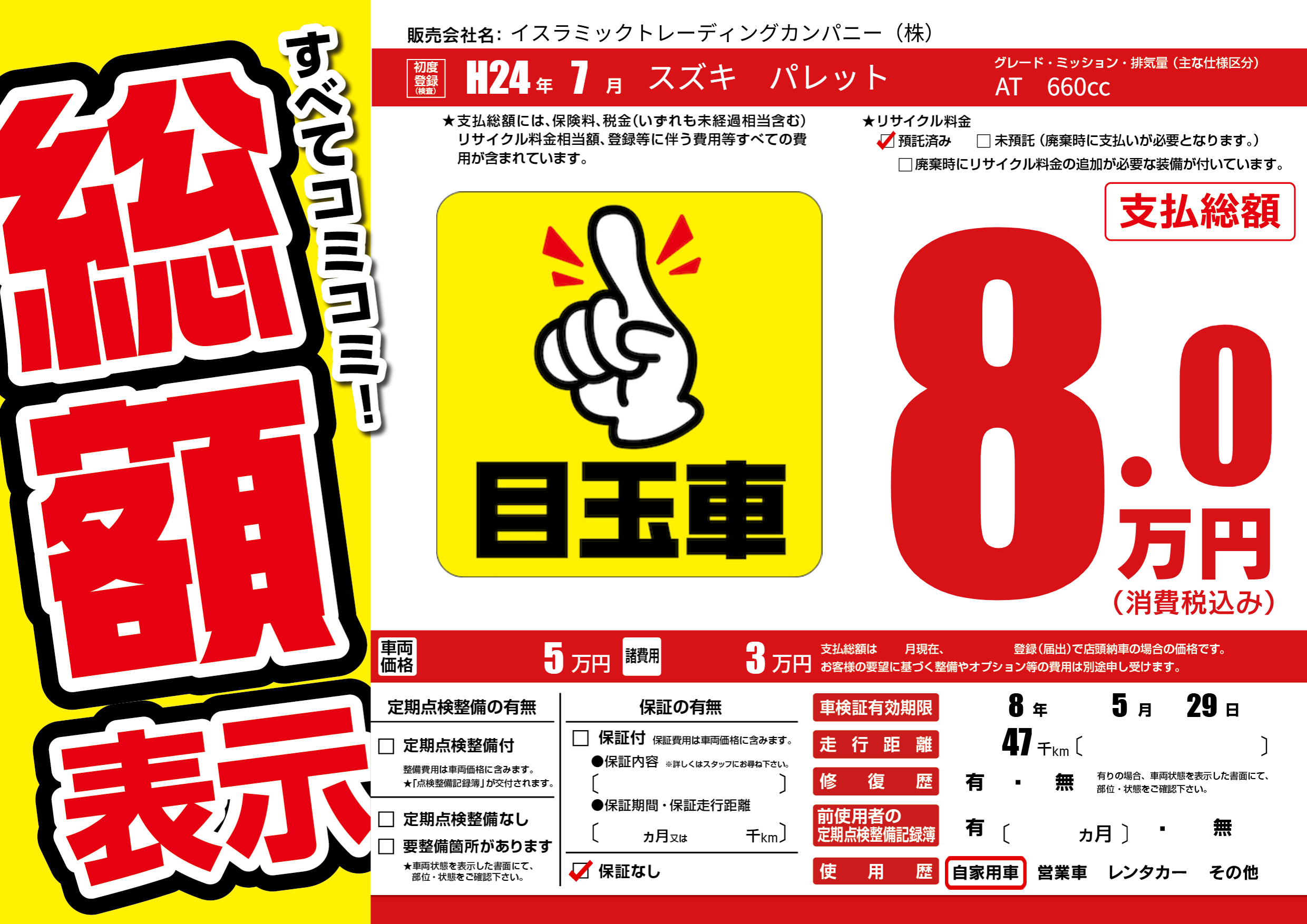 | 車名 | スズキ パレット | グレード ミッション 排気量 |