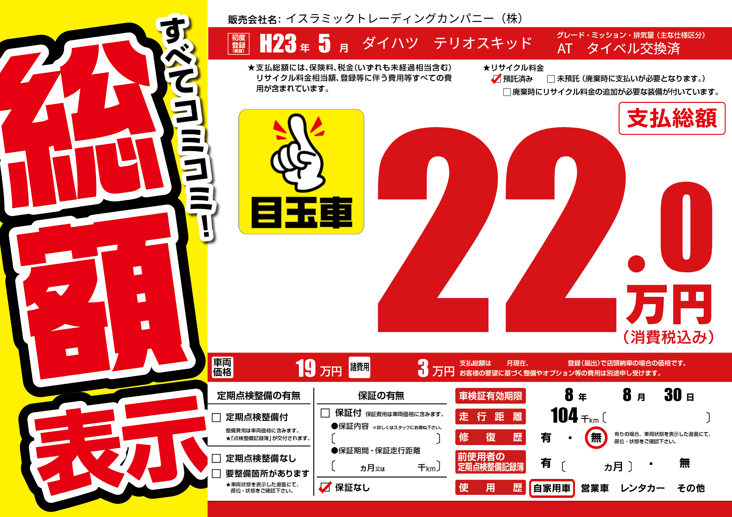 | 車名 | ダイハツ テリオスキッド | グレード ミッション 排気量 |