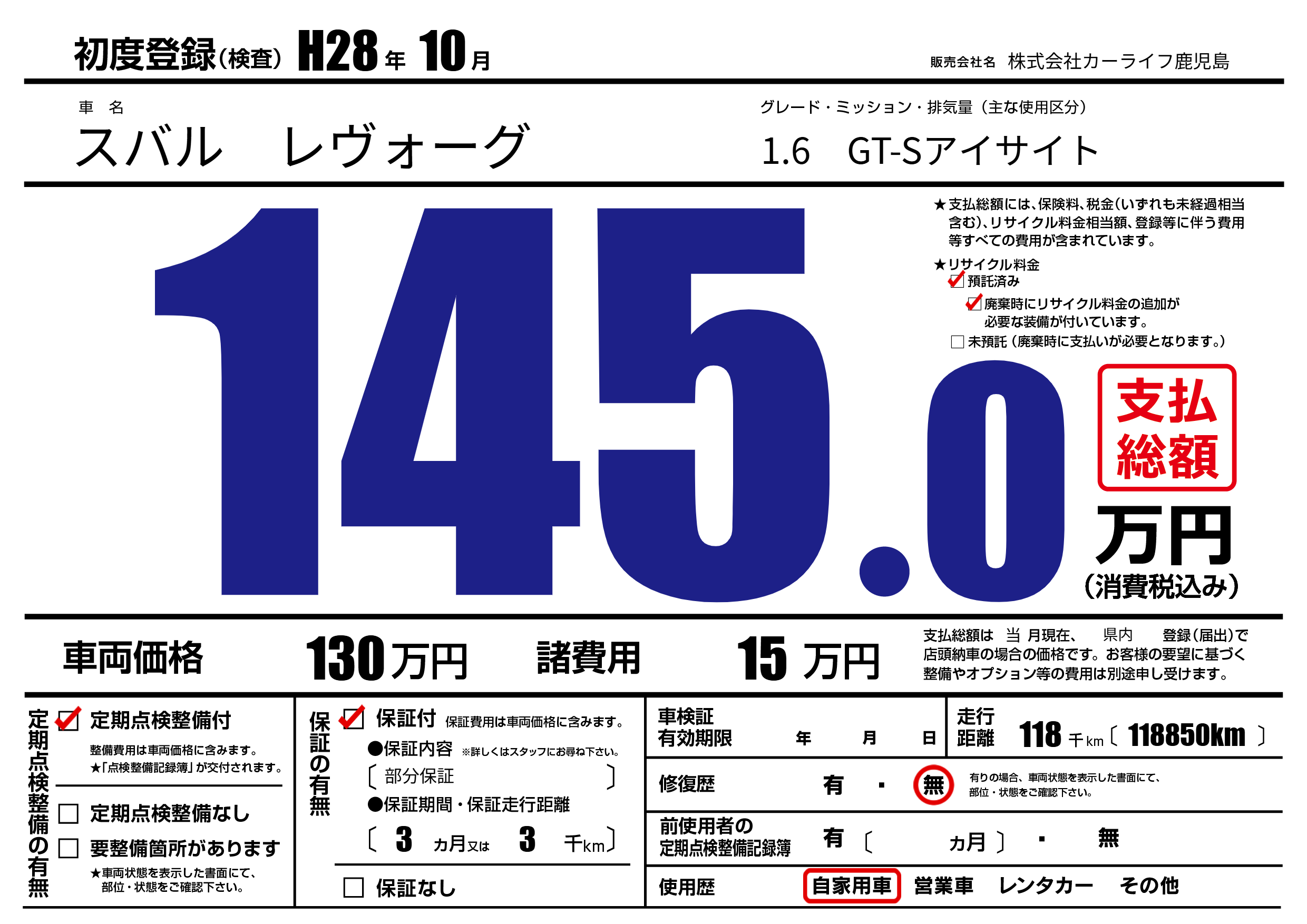 | 車名 | スバル レヴォーグ | グレード ミッション 排気量 |