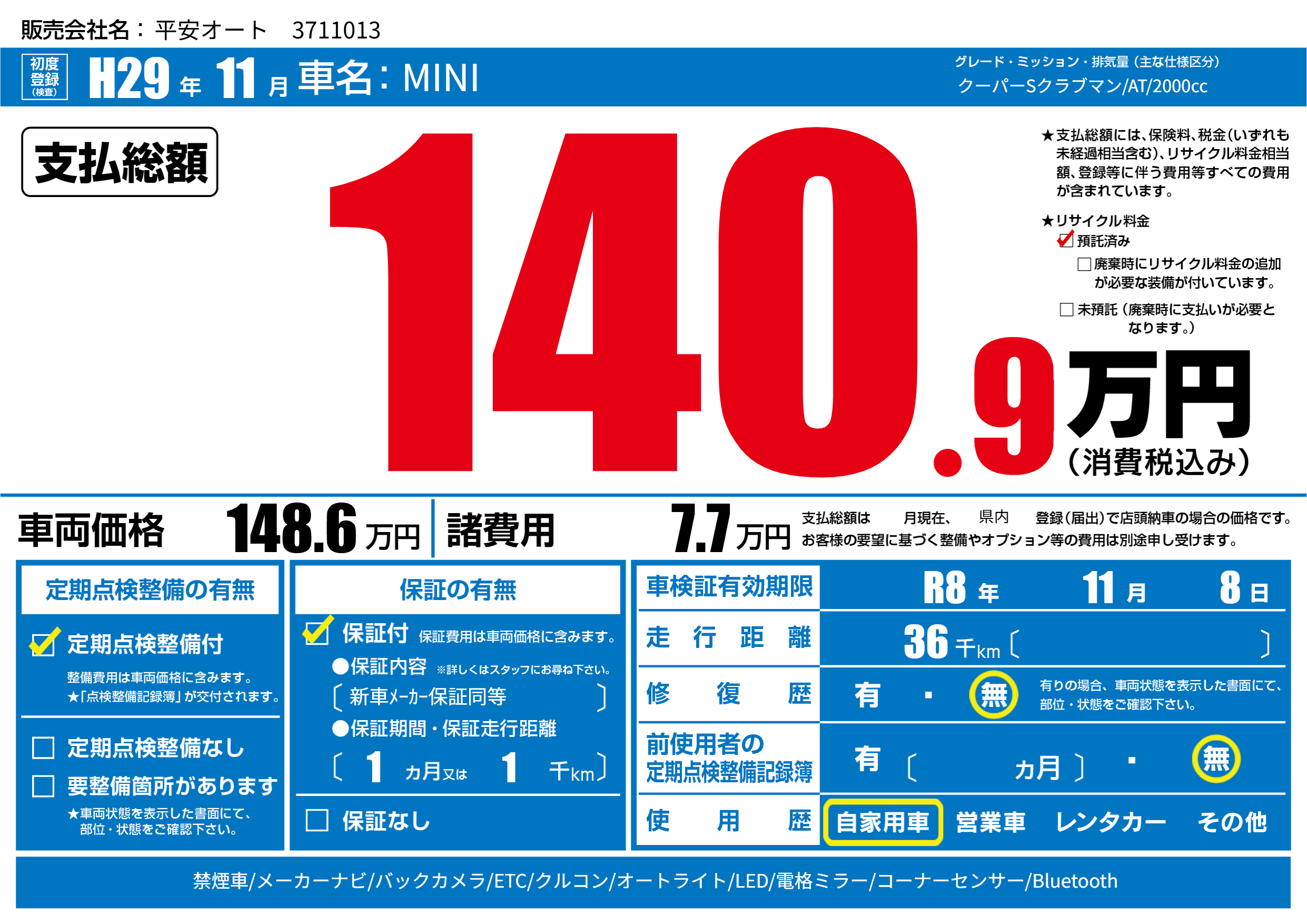 | 車検制限 | R8年 11月 8日 | ||