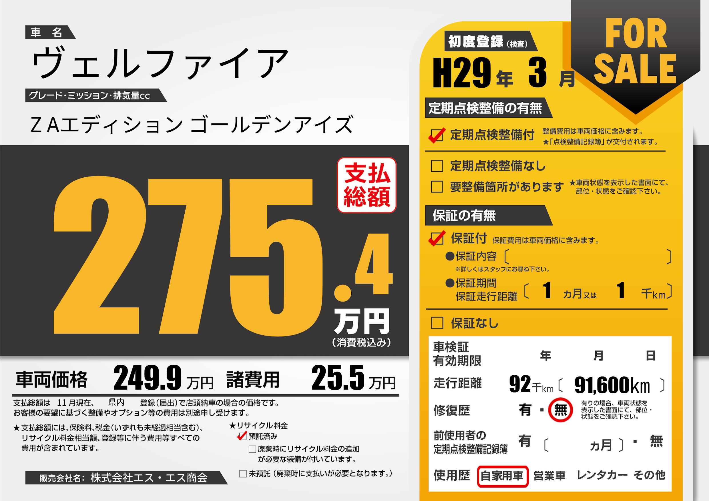 | 車名 | ヴェルファイア | グレード ミッション 排気量 |