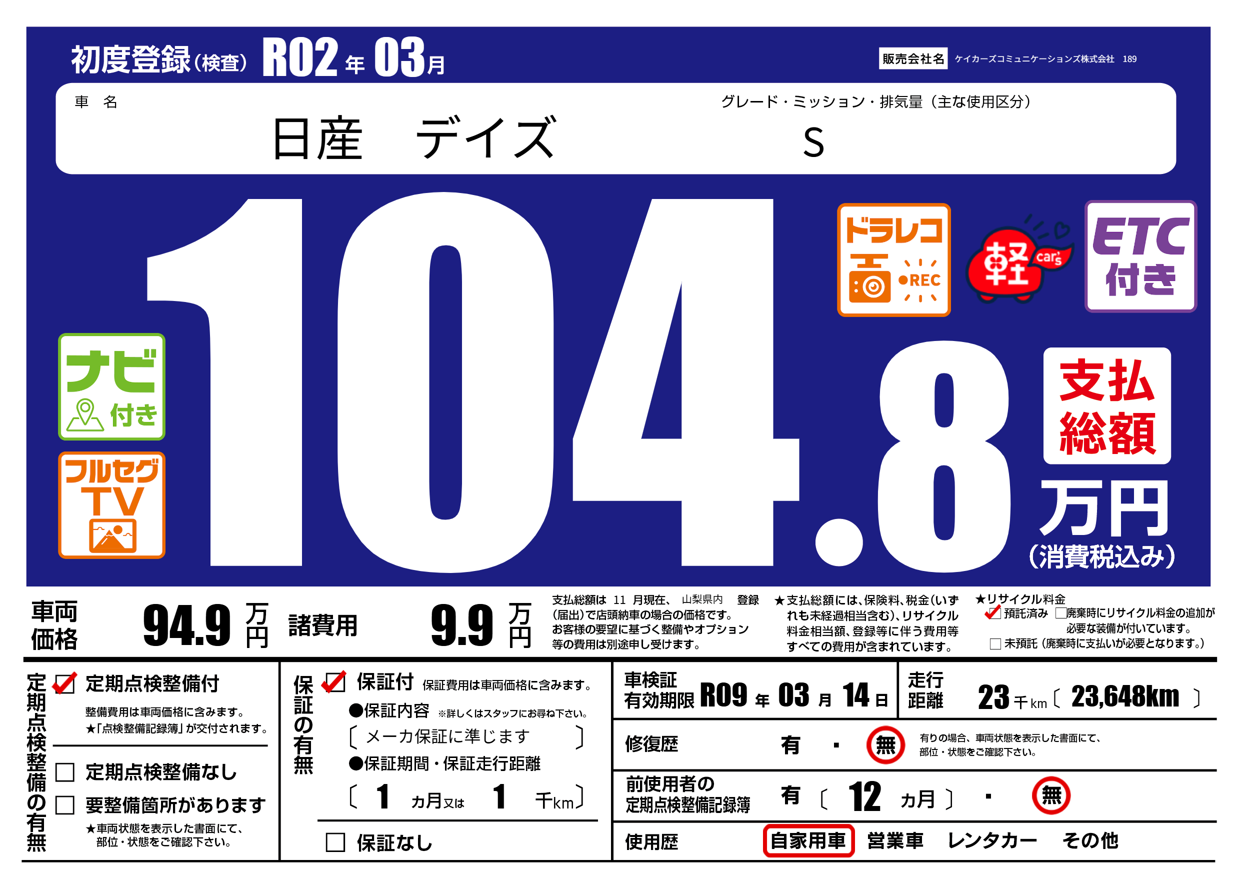 | 走行キロ | 2.3万km | 初年度登録 | R02年03月 |