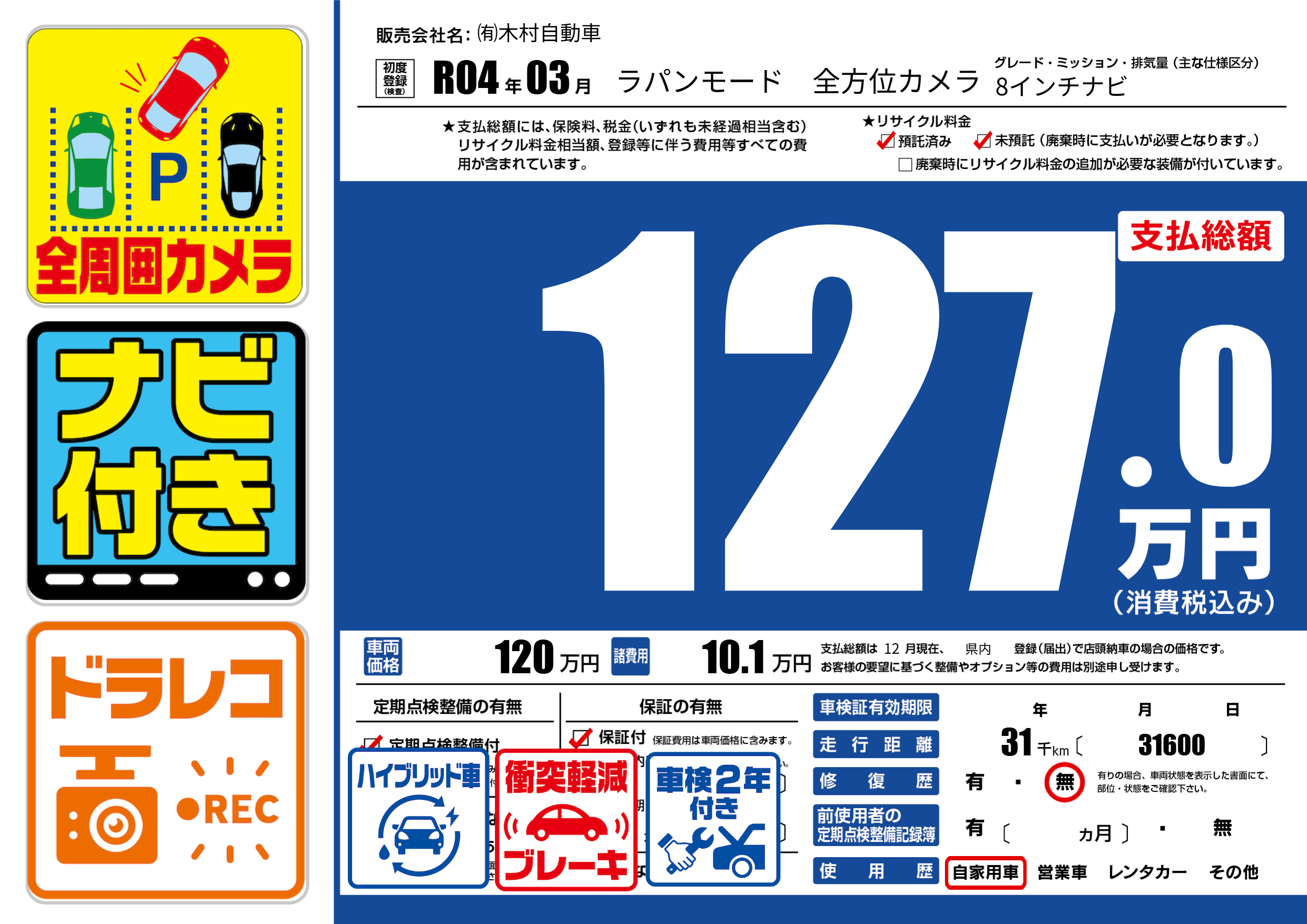 | 車名 | ラパンモード 全方位カメラ | グレード ミッション 排気量 |