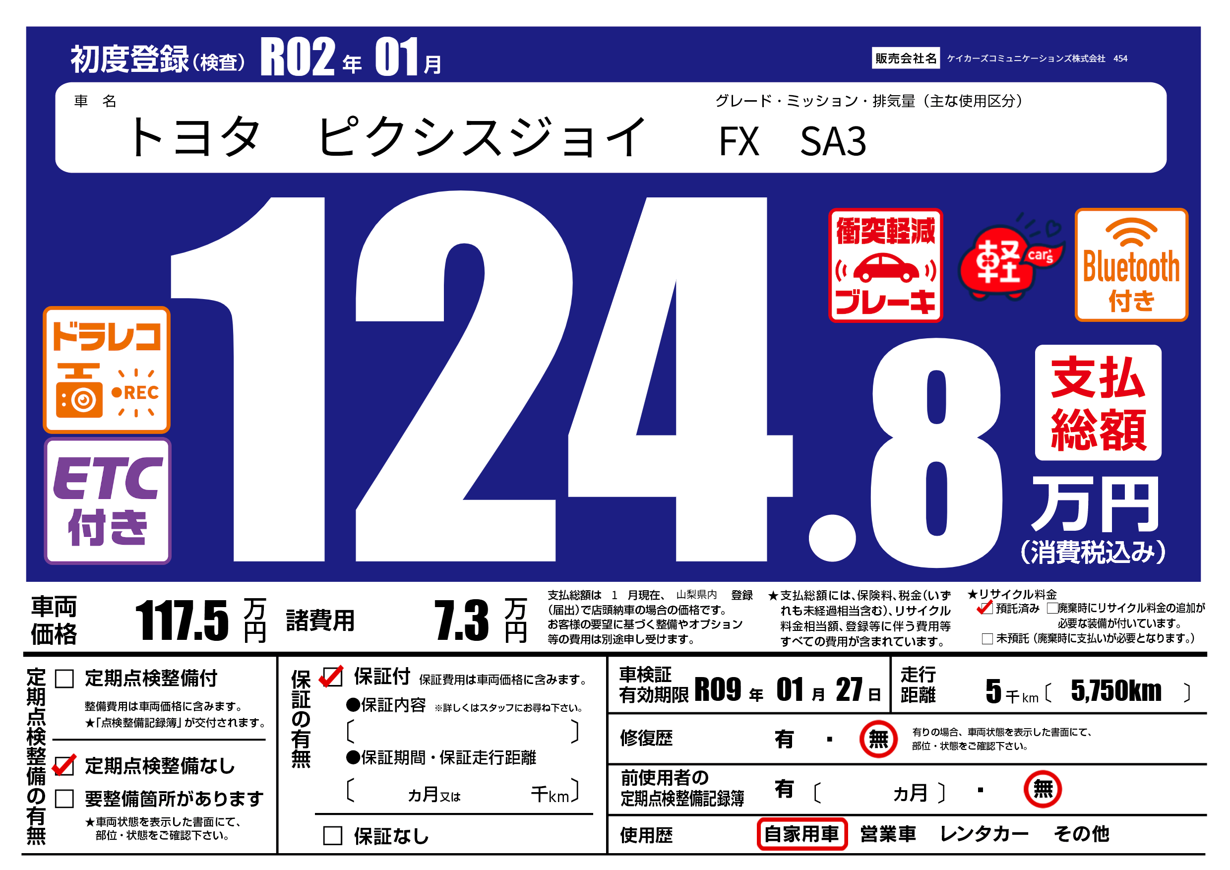 | 走行キロ | 0.5万km | 初年度登録 | R02年01月 |