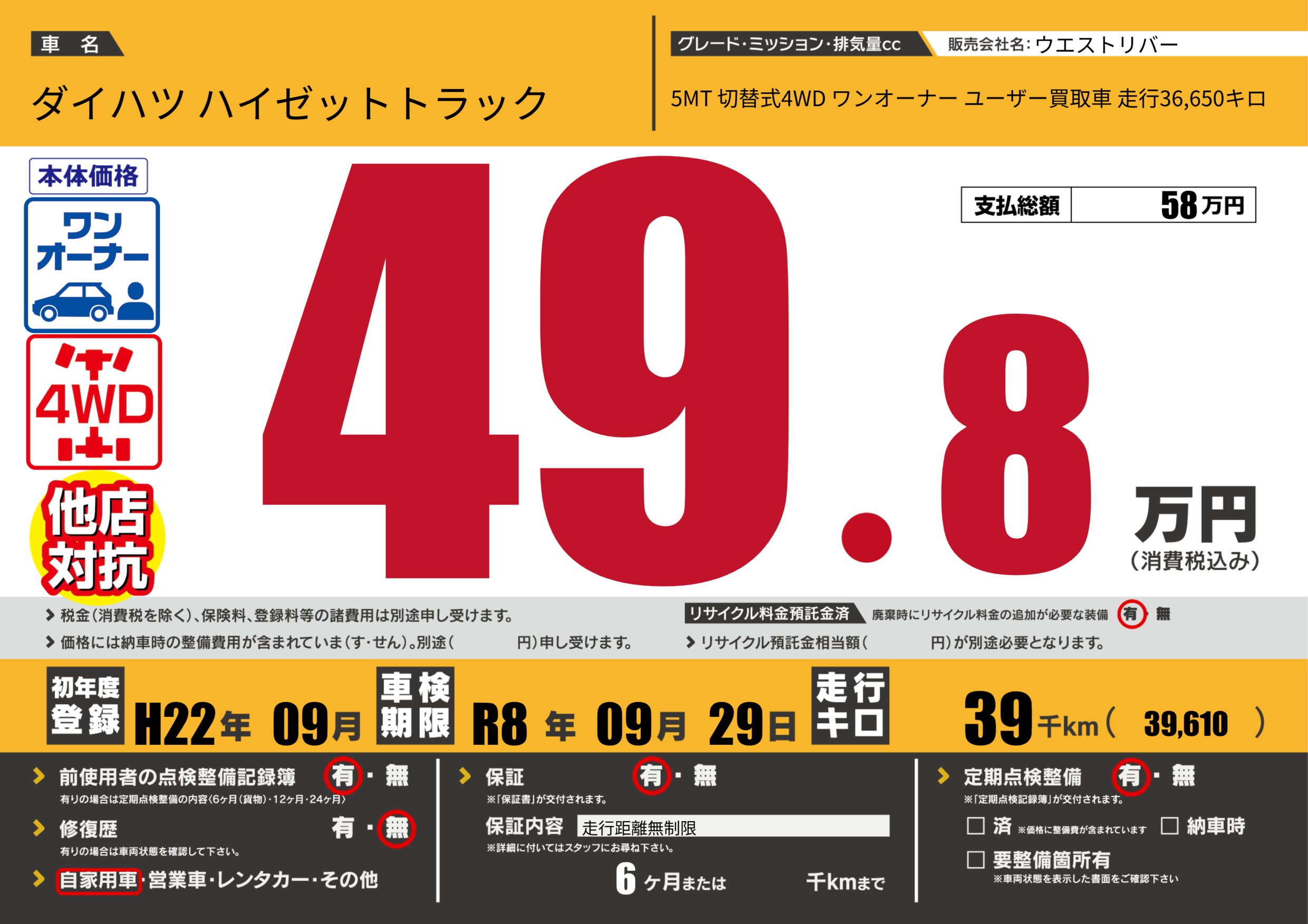 | 走行キロ | 3.9万km | 初年度登録 | H22年09月 |