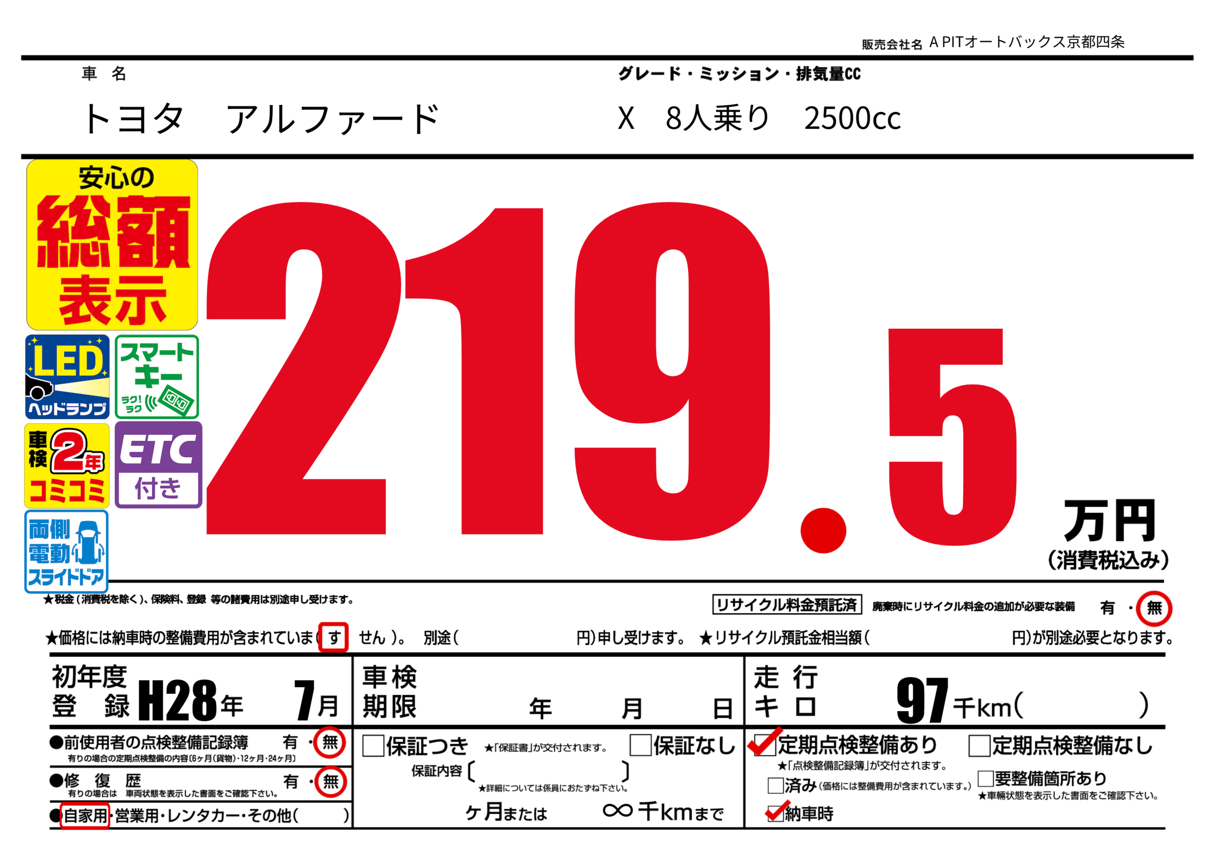 | 走行キロ | 9.7万km | 初年度登録 | H28年7月 |