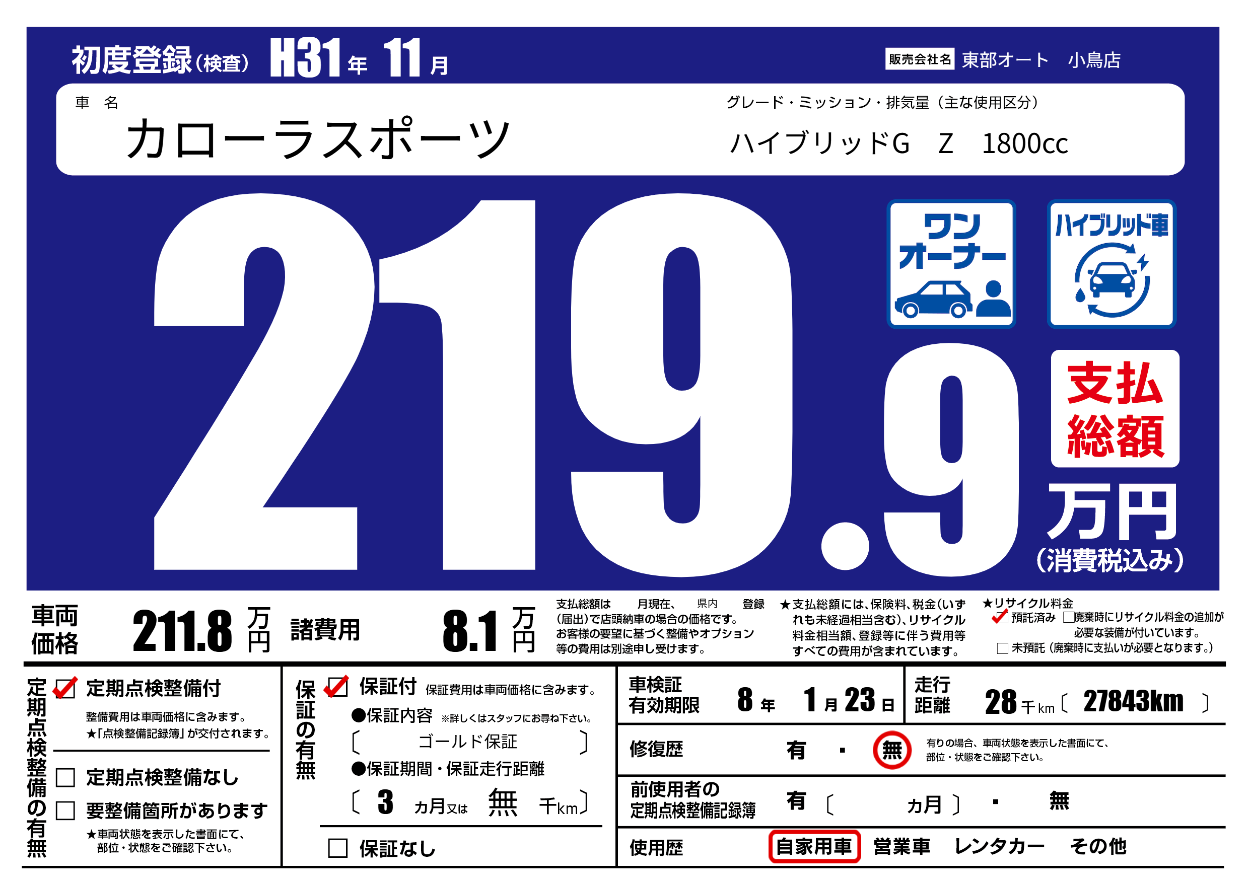 | 走行キロ | 2.8万km | 初年度登録 | H31年11月 |