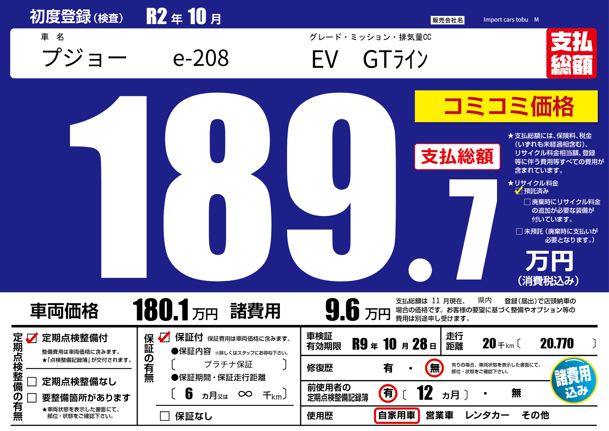 | 車名 | プジョー e-208 | グレード ミッション 排気量 |