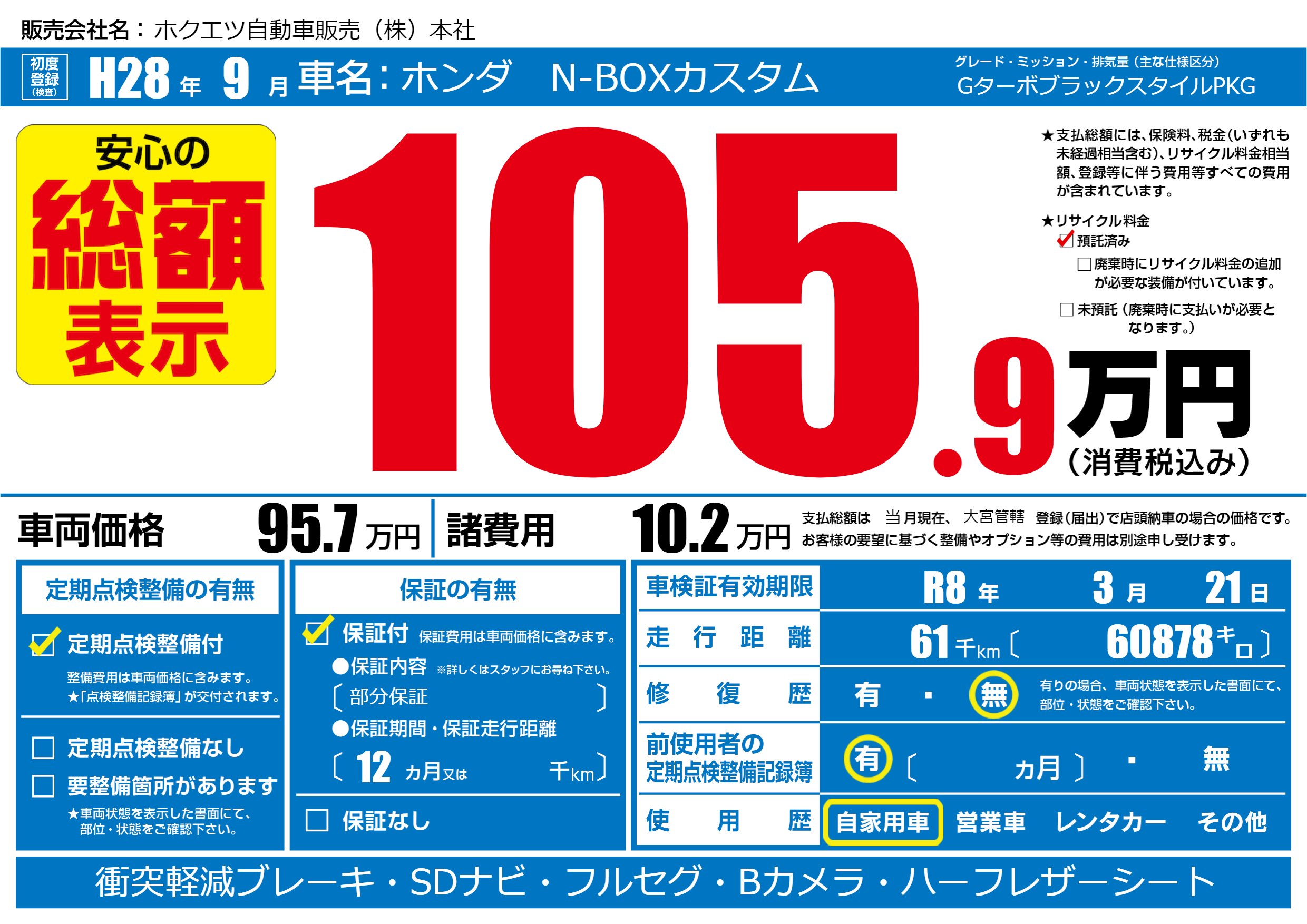 | 走行キロ | 6.1万km | 初年度登録 | H28年9月 |