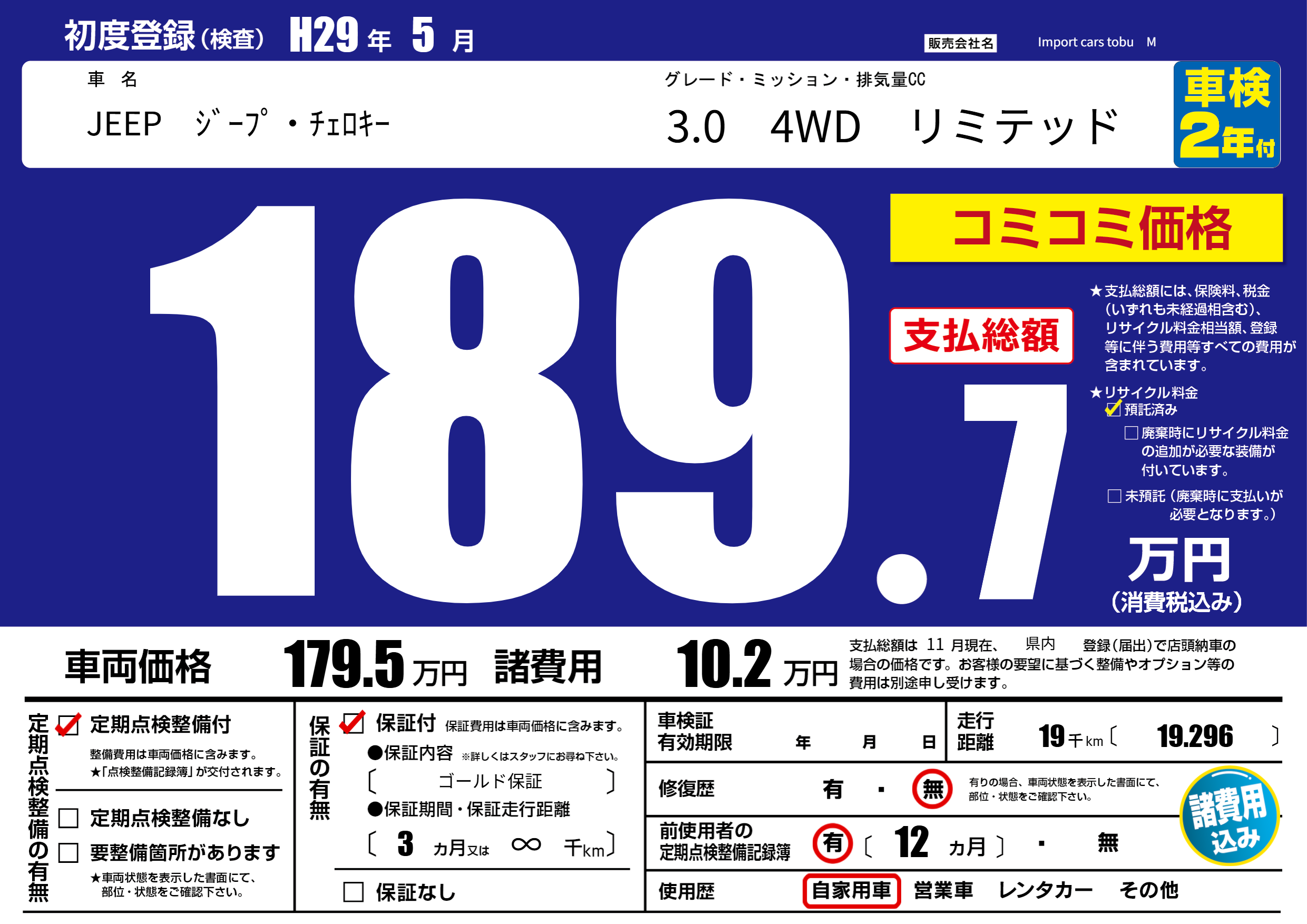 | 車名 | JEEP ジープ・チェロキー | グレード ミッション 排気量 |