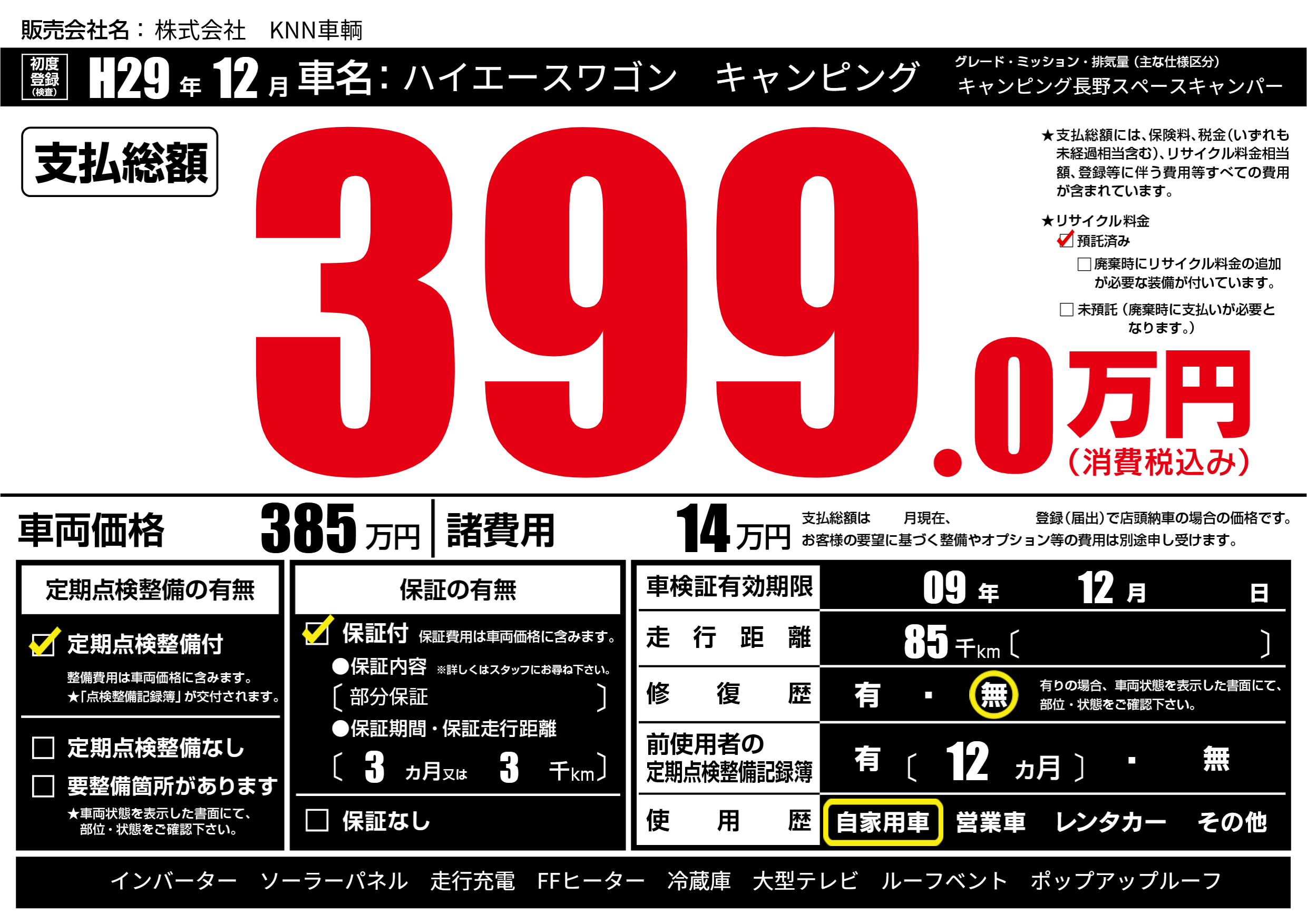 | 車名 | ハイエースワゴン キャンピング | グレード ミッション 排気量 |