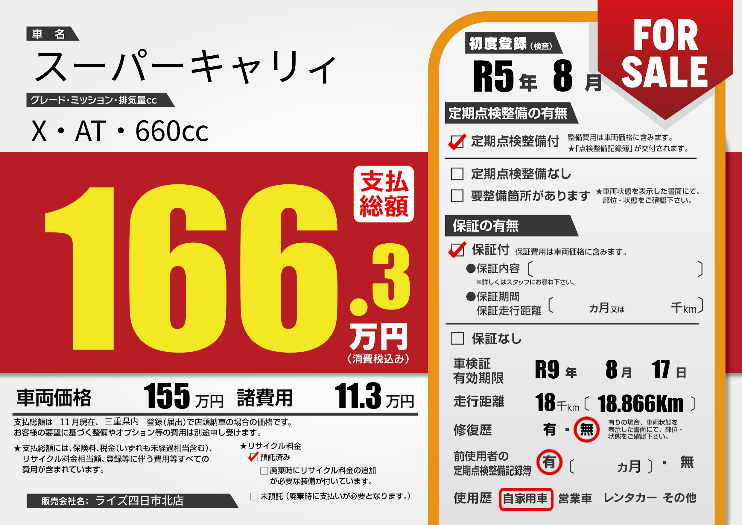 | 走行キロ | 1.8万km | 初年度登録 | R5年8月 |