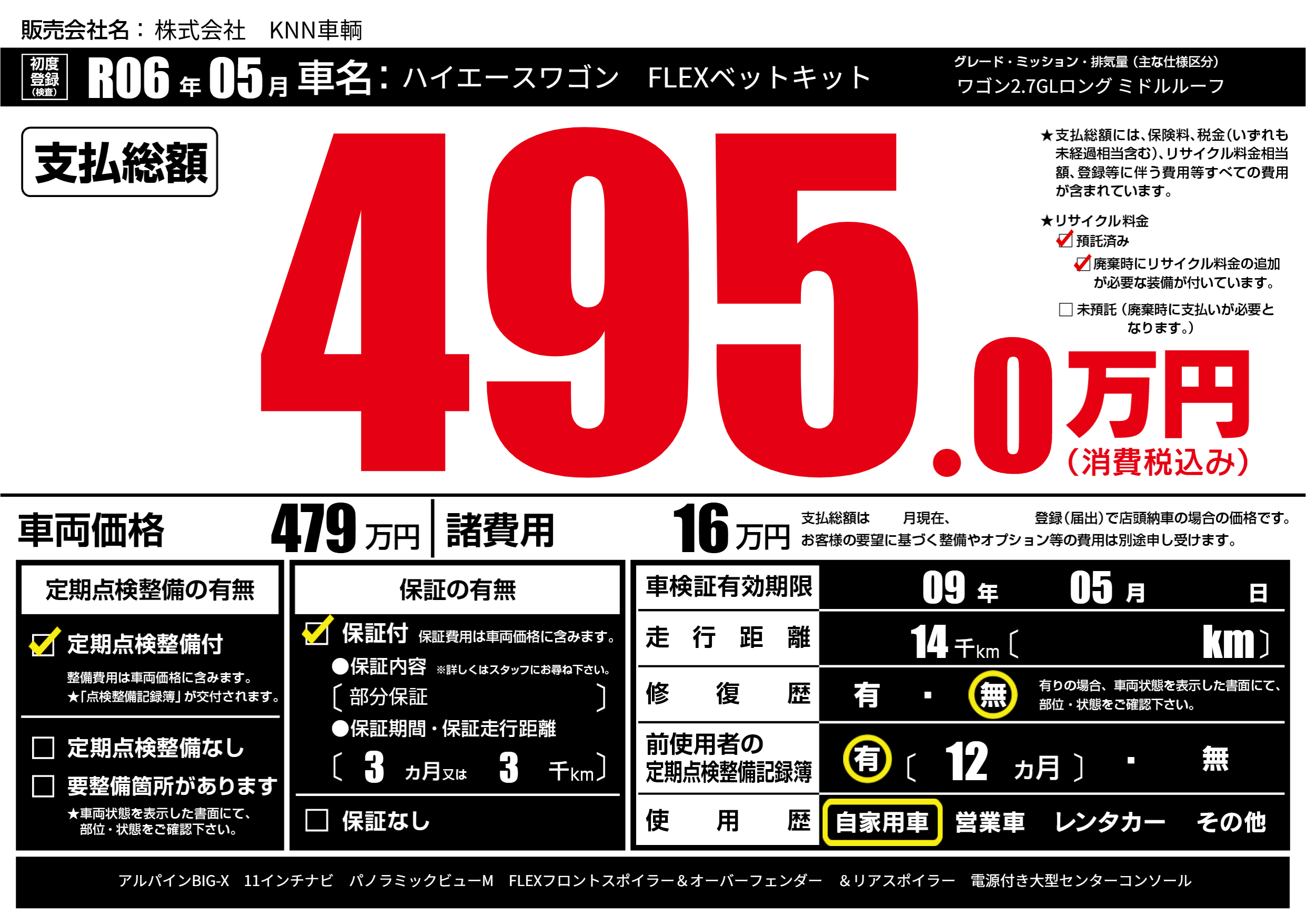 | 車名 | ハイエースワゴン FLEXベットキット | グレード ミッション 排気量 |
