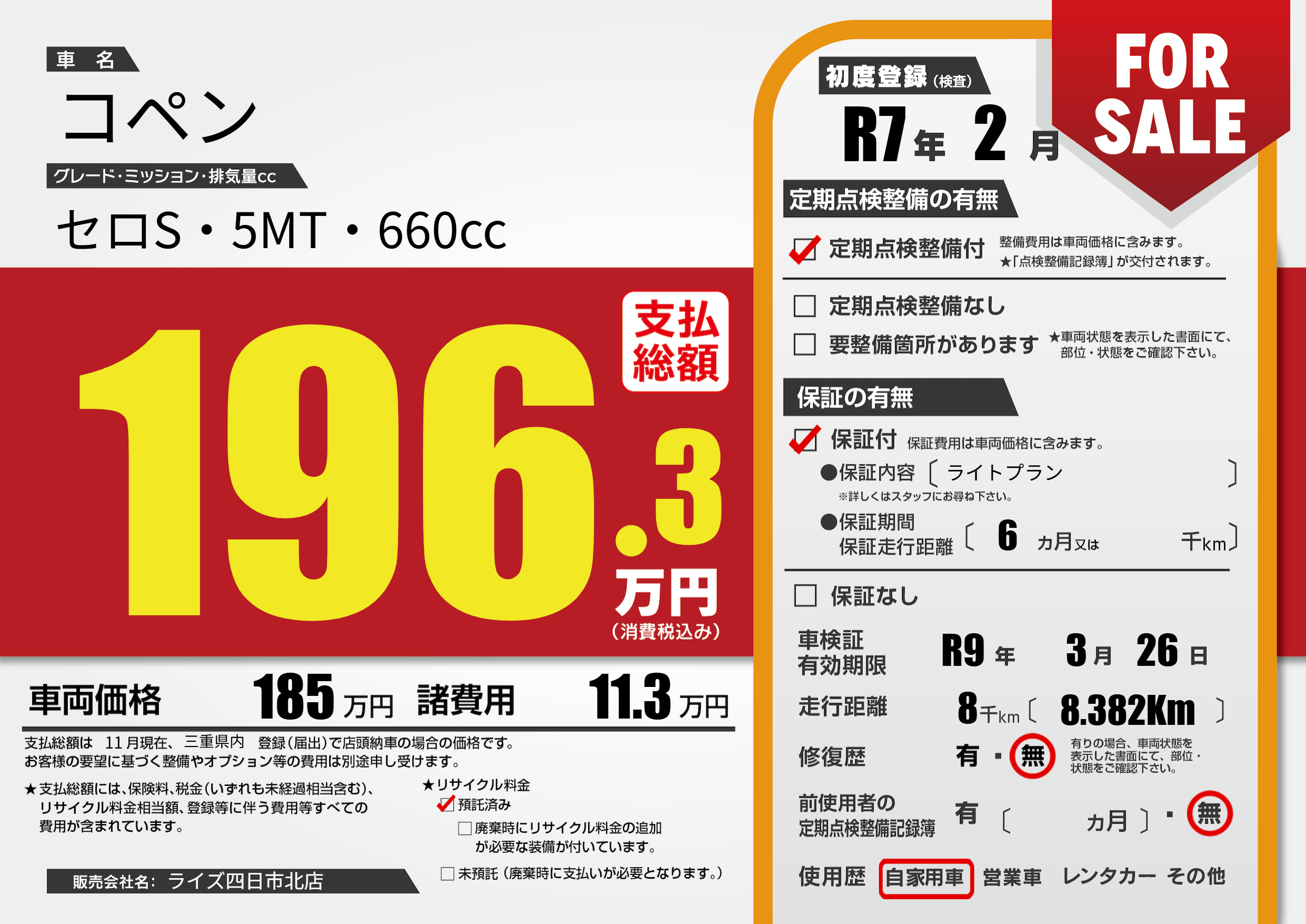 | 走行キロ | 0.8万km | 初年度登録 | R7年2月 |