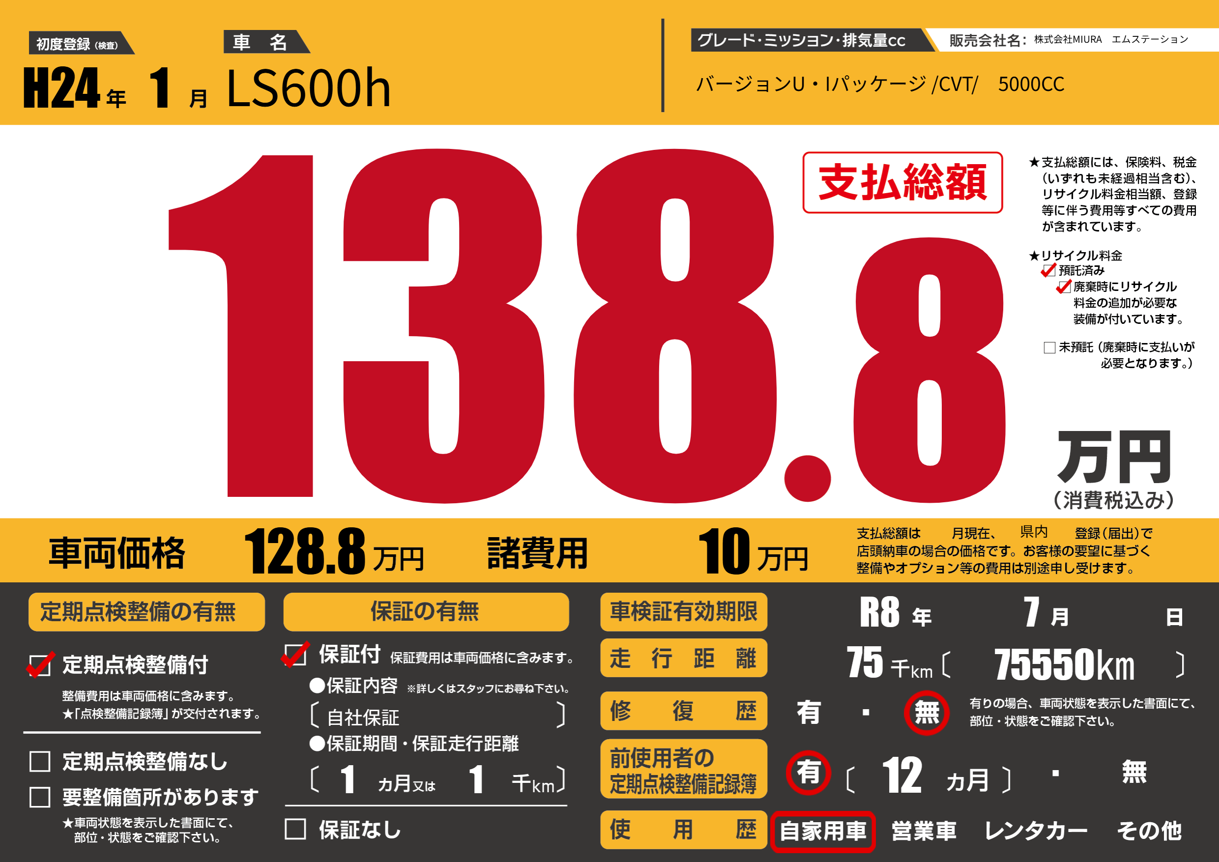| 走行キロ | 7.5万km | 初年度登録 | H24年1月 |