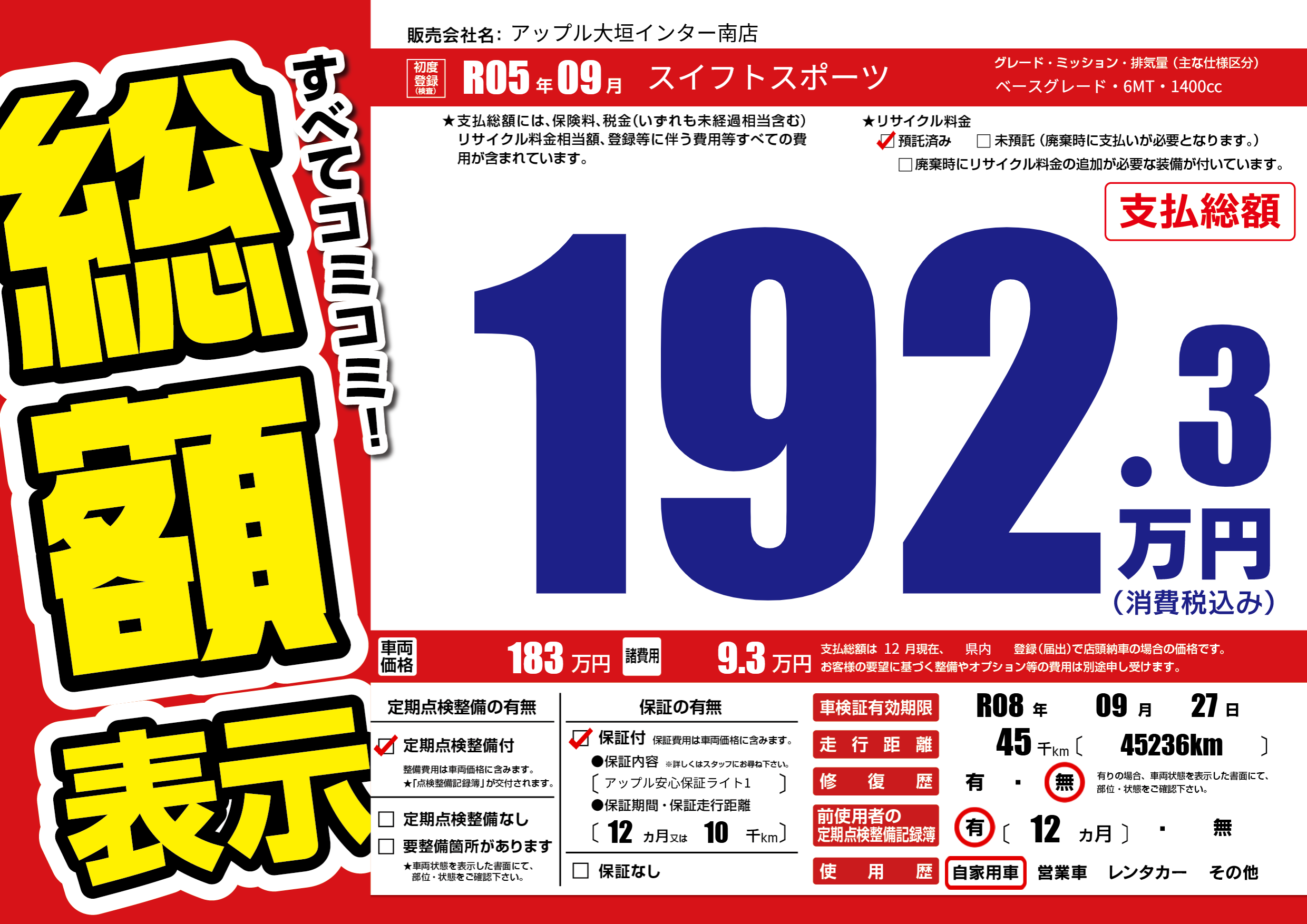 | 車名 | スイフトスポーツ | グレード ミッション 排気量 |