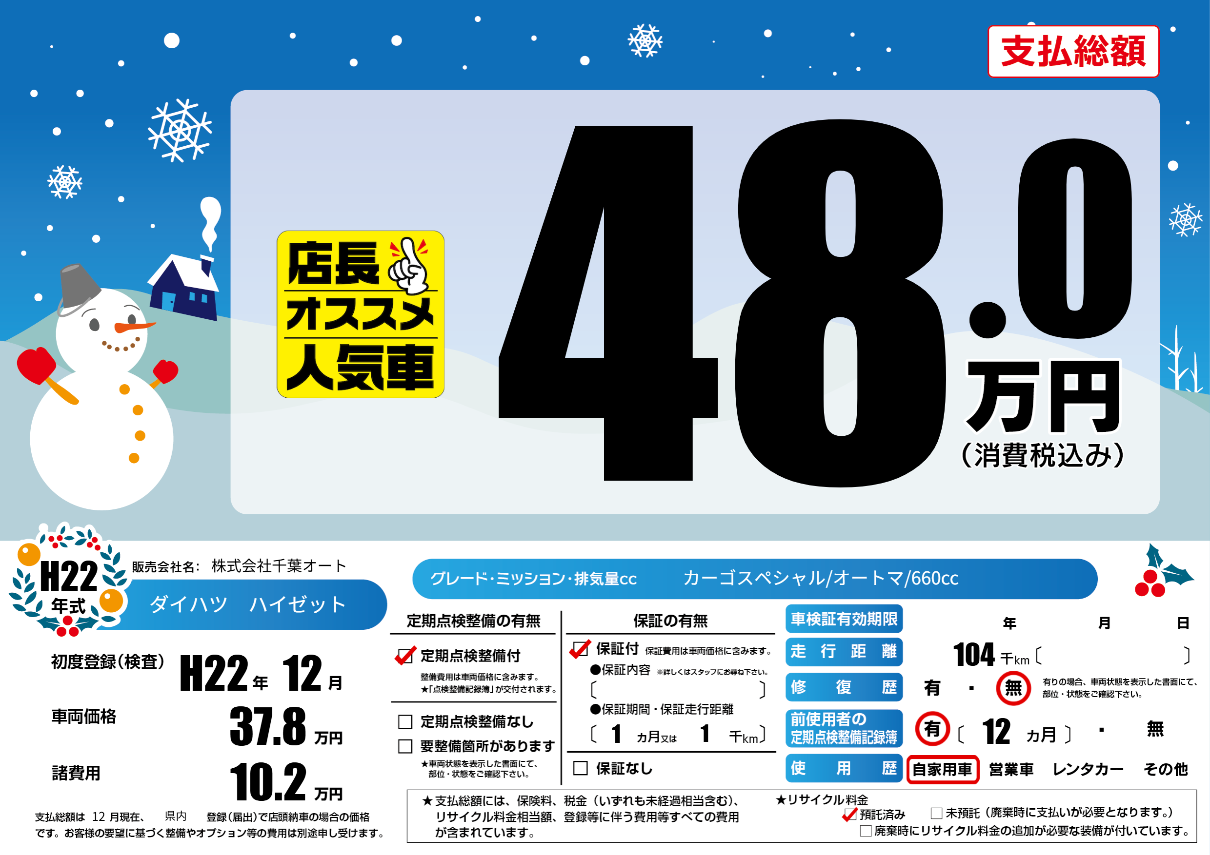 | 走行キロ | 10.4万km | 初年度登録 | H22年12月 |