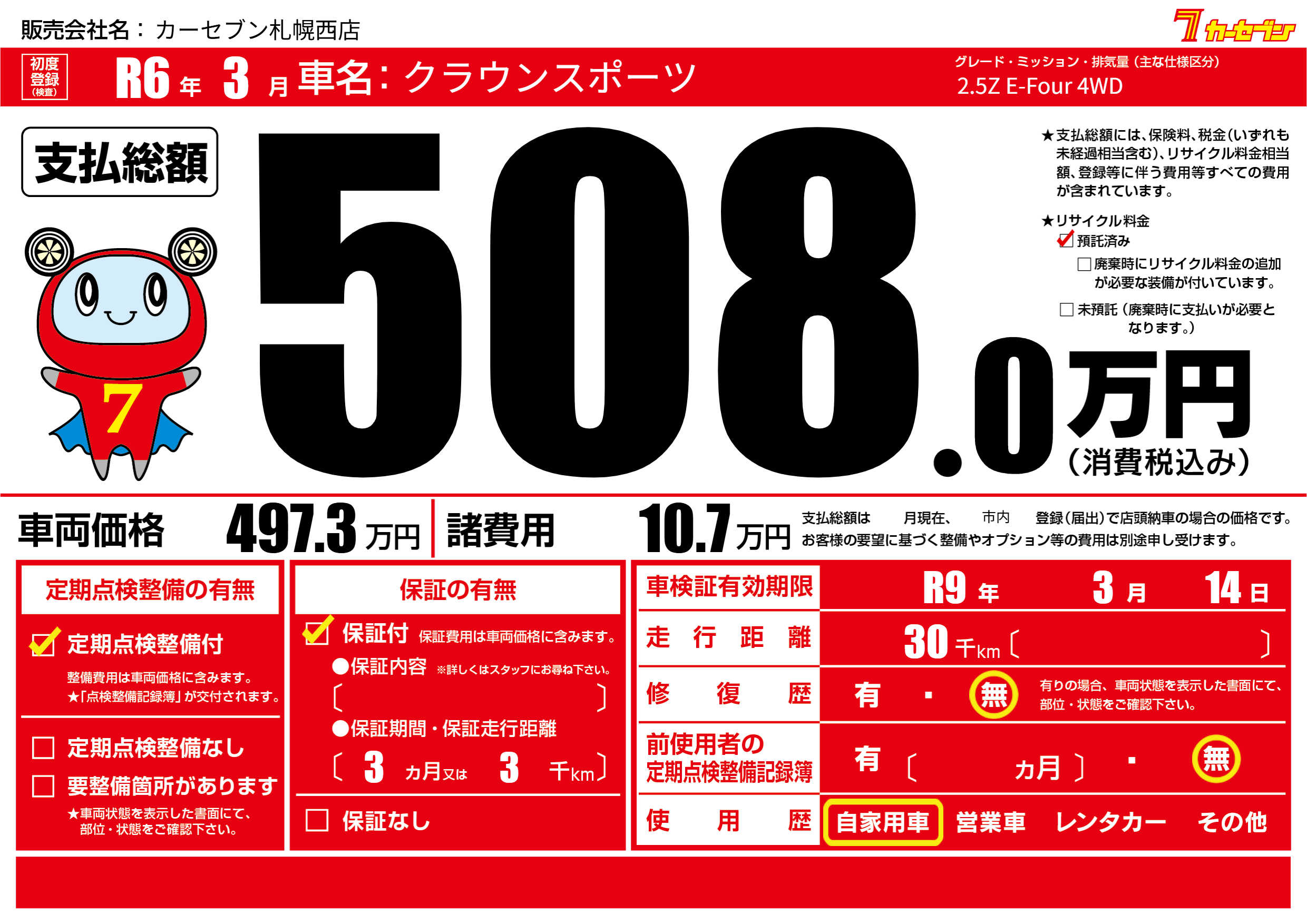 | 走行キロ | 3万km | 初年度登録 | R6年3月 |