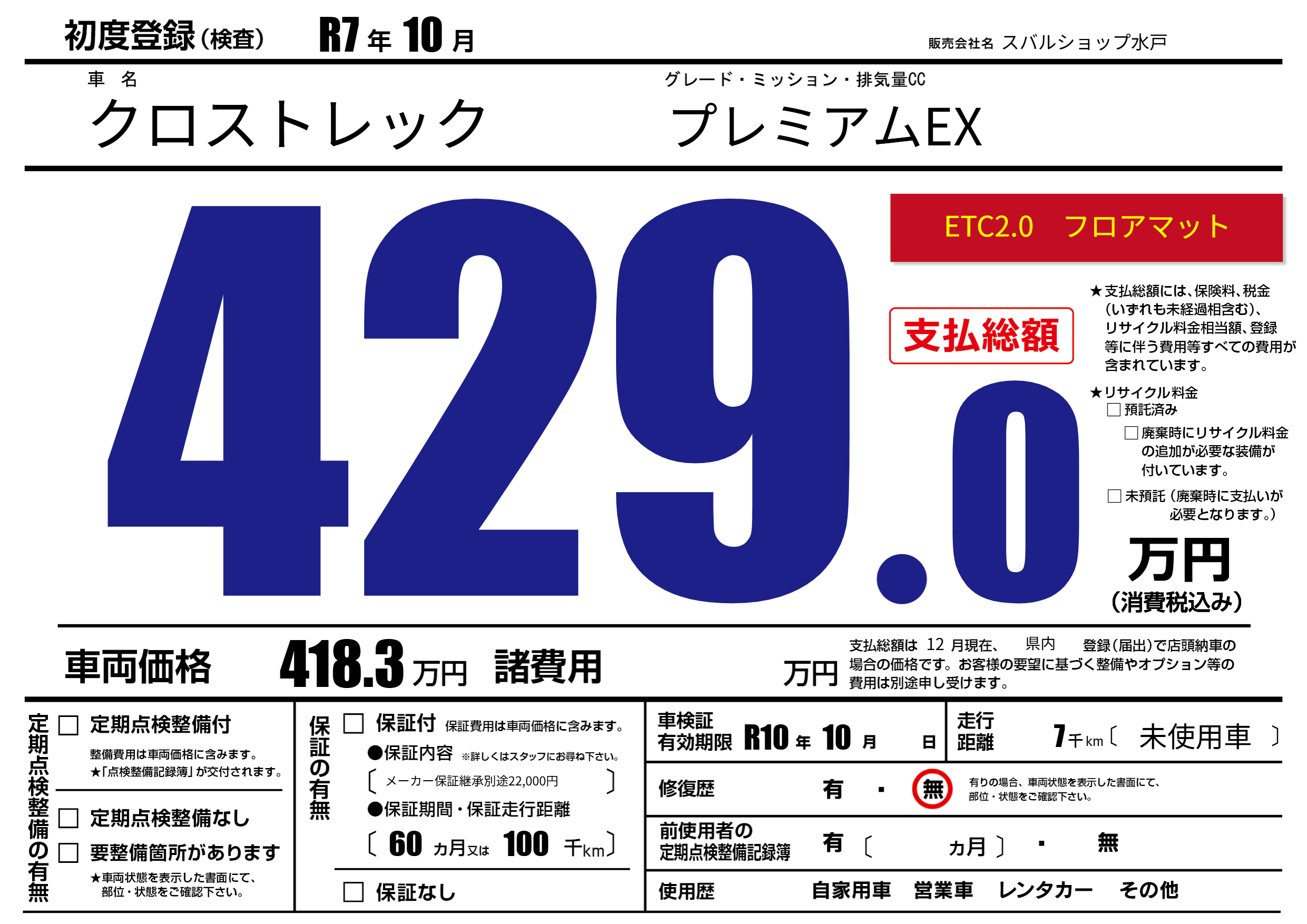 | 車名 | クロストレック | グレード ミッション 排気量 |