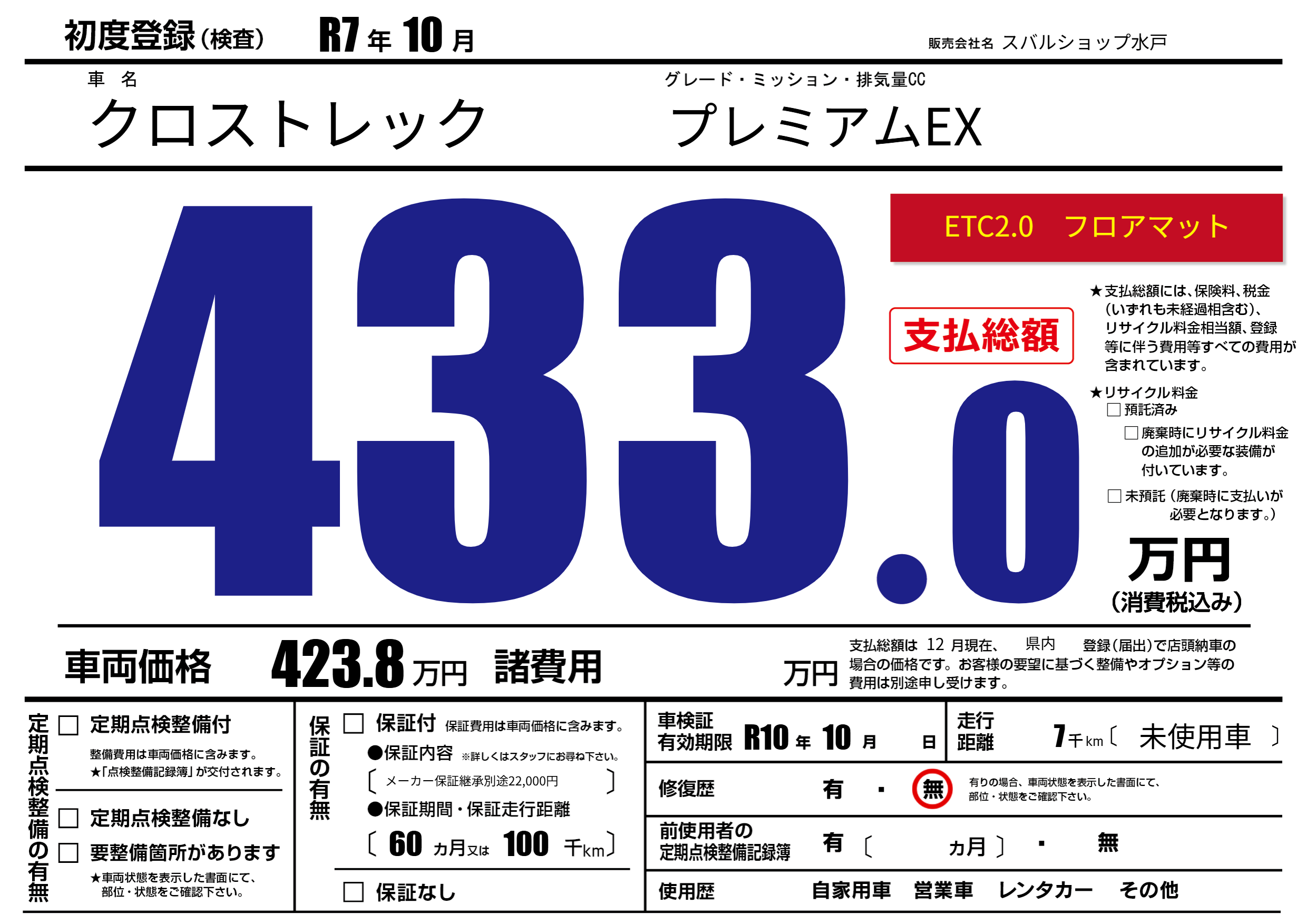 | 車検制限 | R10年 10月 - 日 | ||