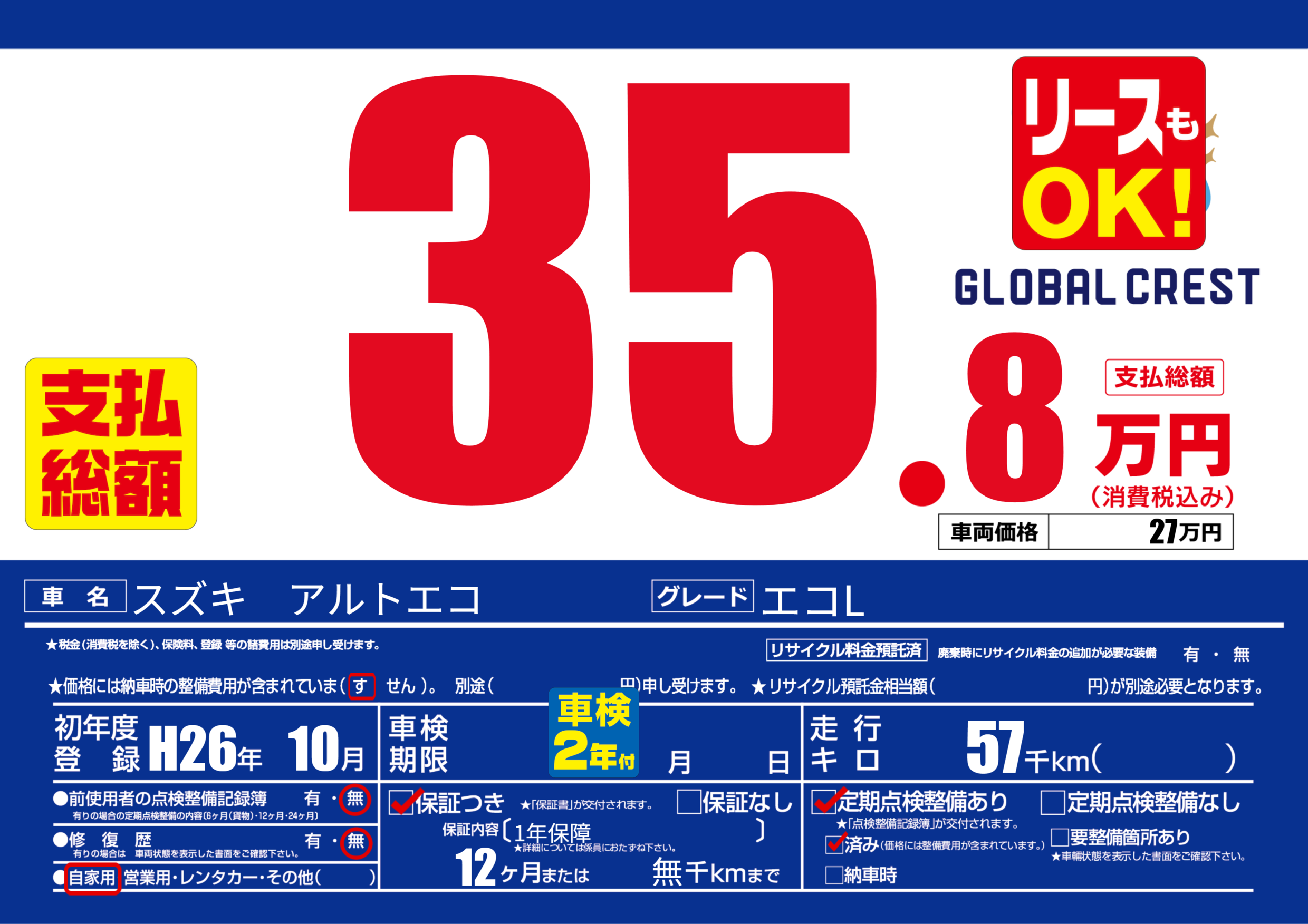 | 定期点検整備 | 定期点検整備あり 定期点検整備済み | ||