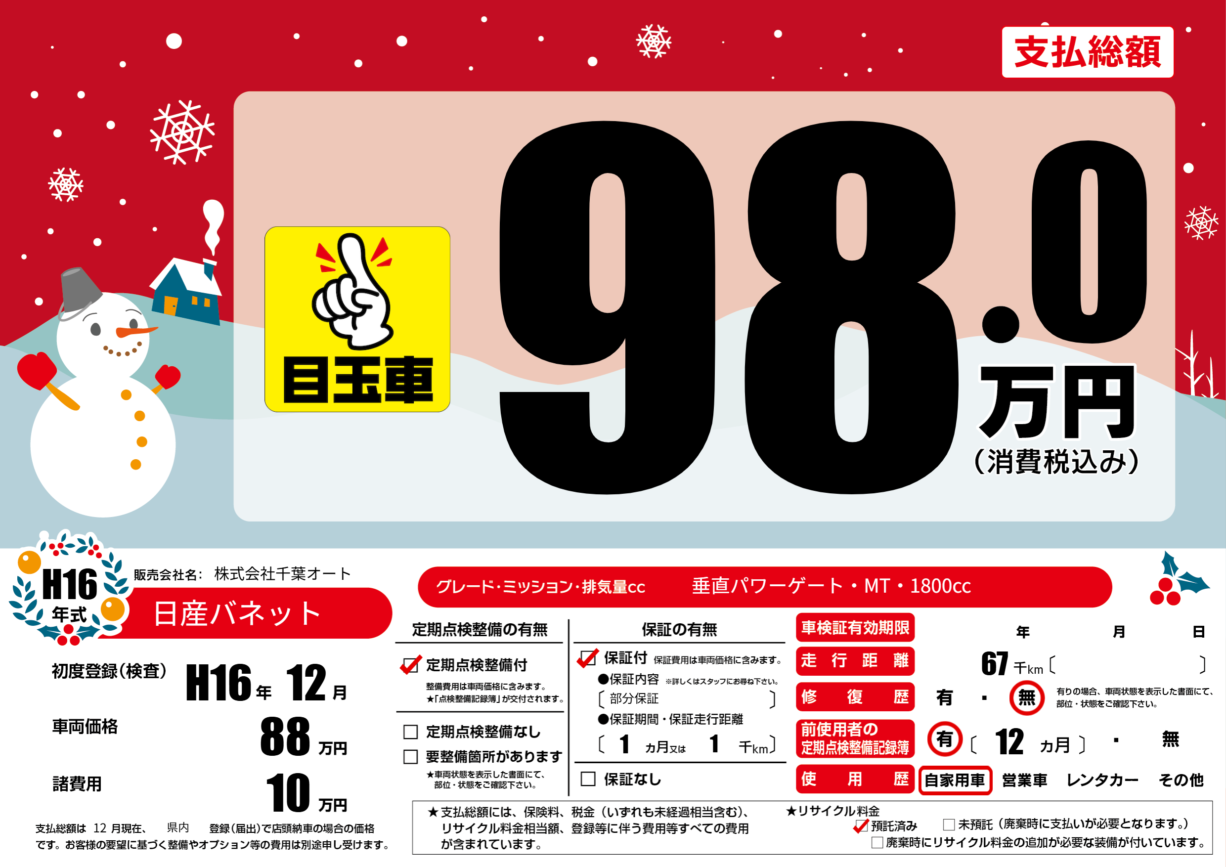 | 車名 | 日産バネット | グレード ミッション 排気量 |
