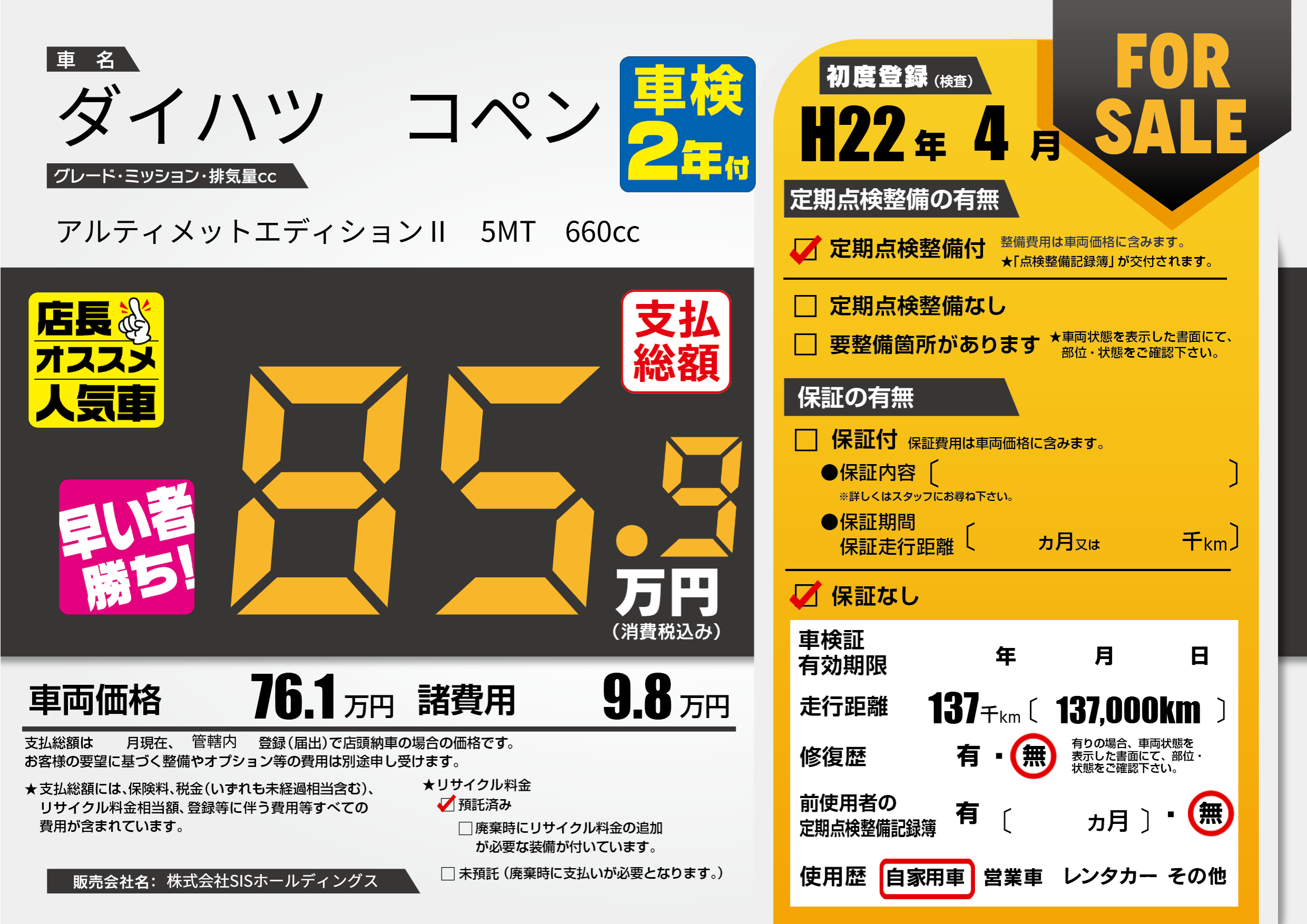 | 車名 | ダイハツ コペン | グレード ミッション 排気量 |