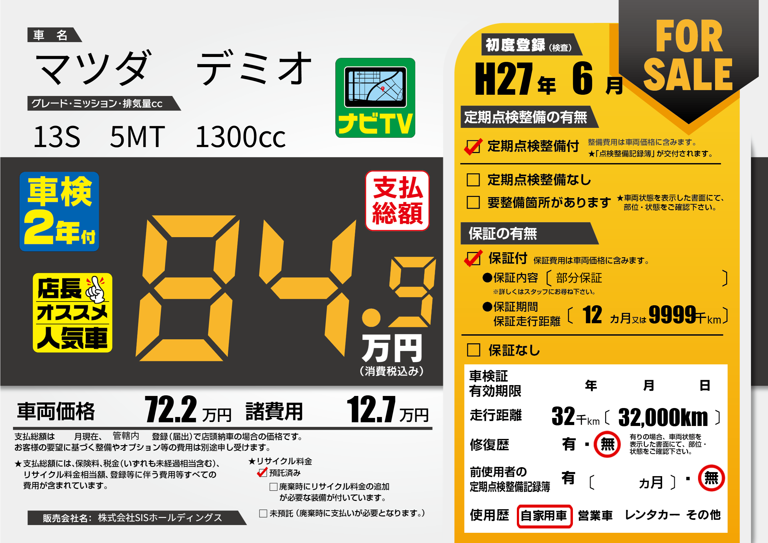 | 走行キロ | 3.2万km | 初年度登録 | H27年6月 |