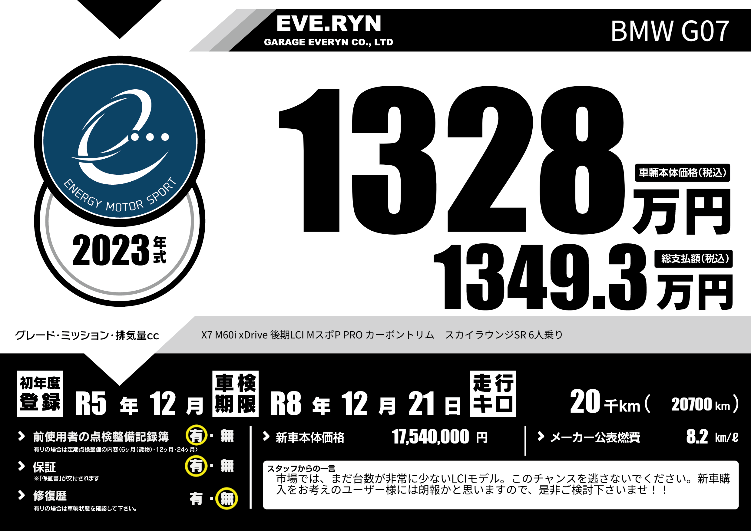 | 車名 | BMW G07 | グレード ミッション 排気量 |