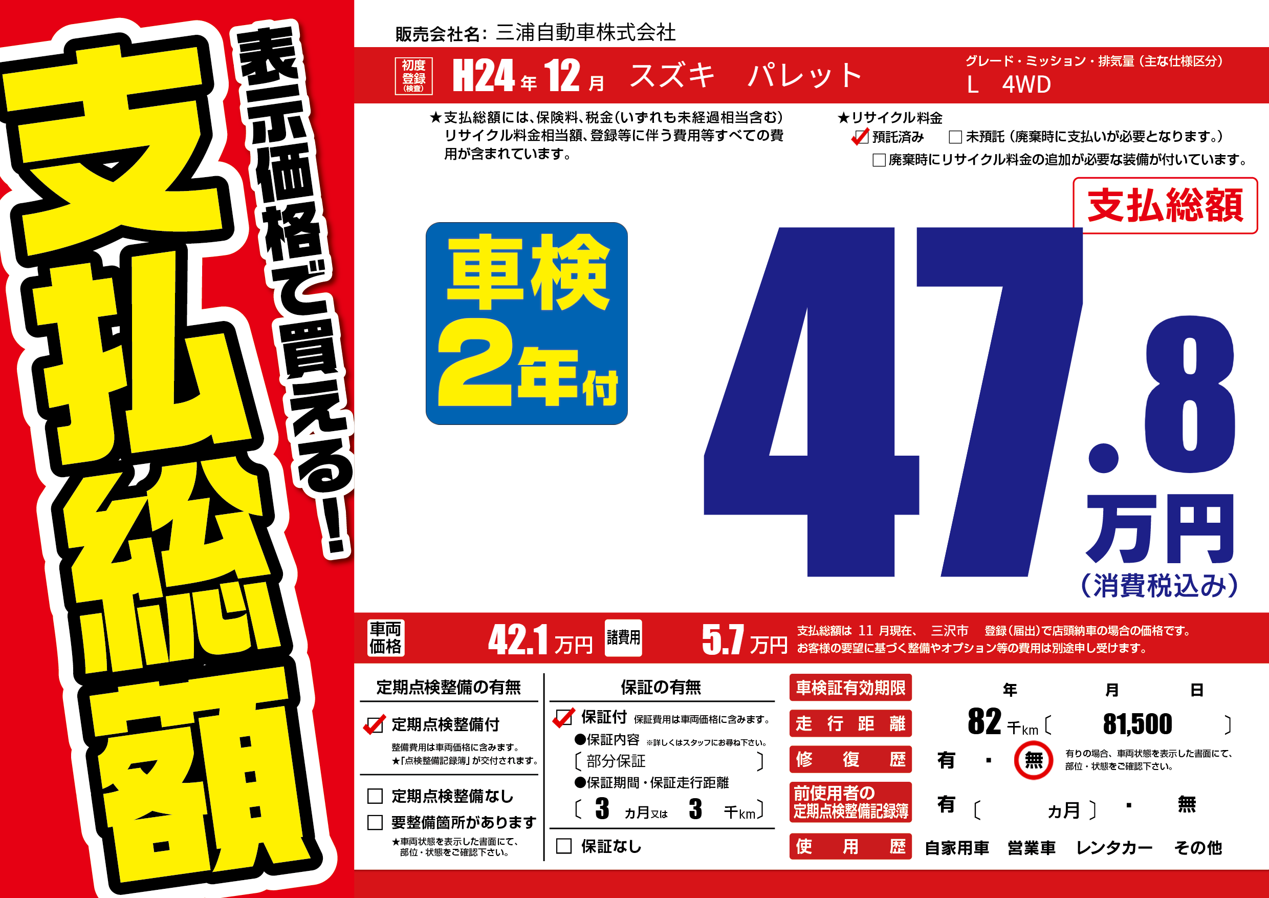 | 車名 | スズキ パレット | グレード ミッション 排気量 |