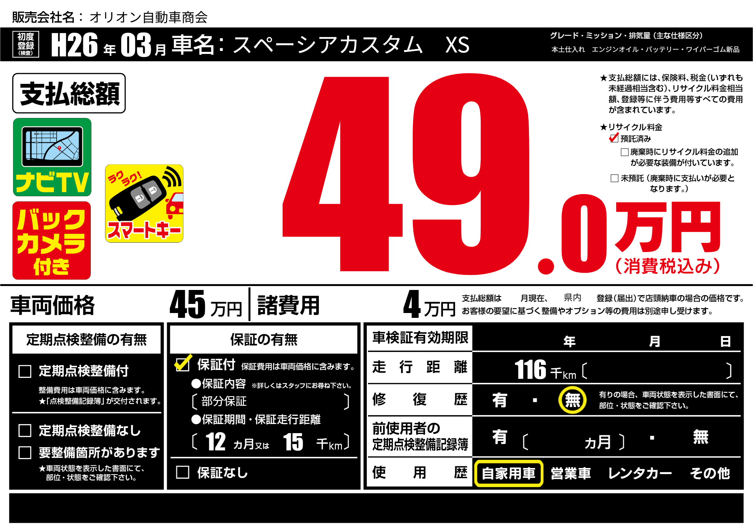 | 走行キロ | 11.6万km | 初年度登録 | H26年03月 |