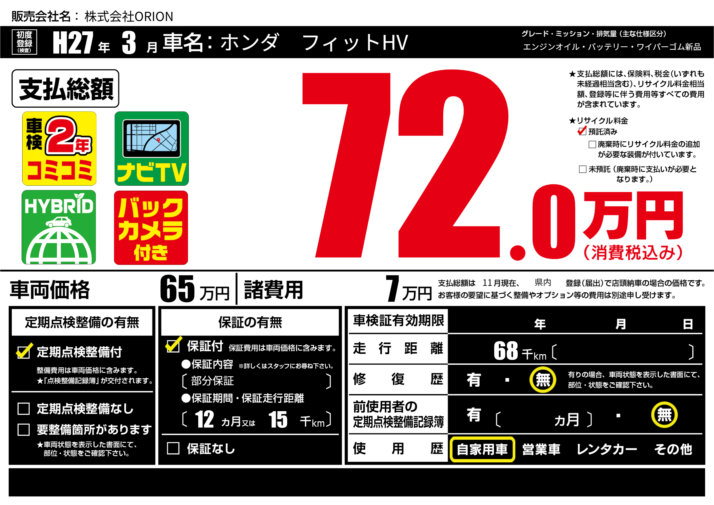 | 走行キロ | 6.8万km | 初年度登録 | H27年3月 |