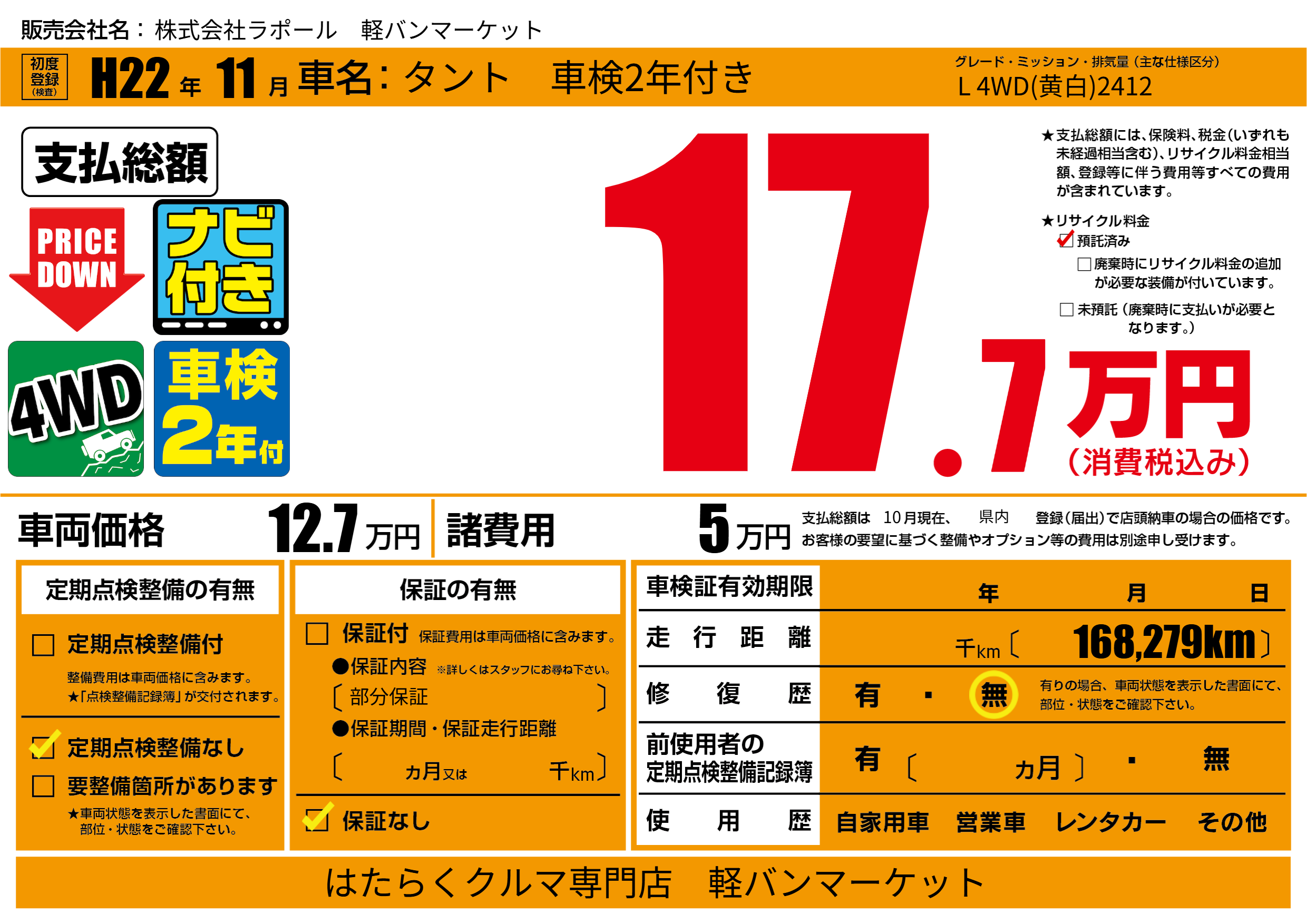 | 車名 | タント 車検2年付き | グレード ミッション 排気量 |