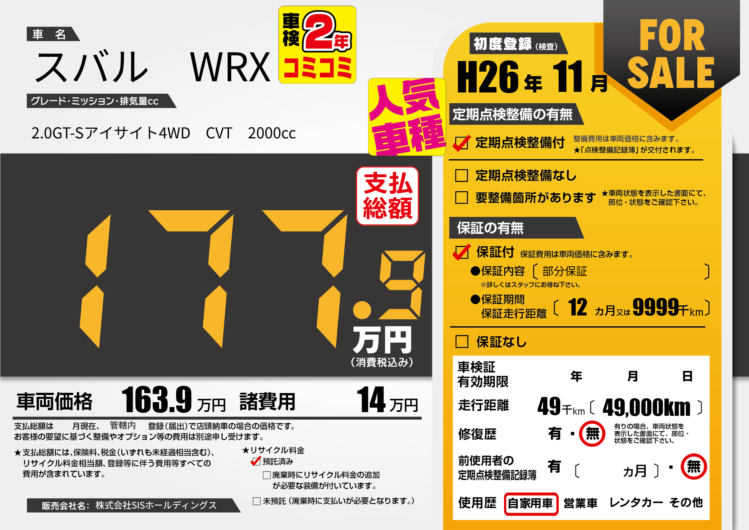 | 車名 | スバル WRX | グレード ミッション 排気量 |