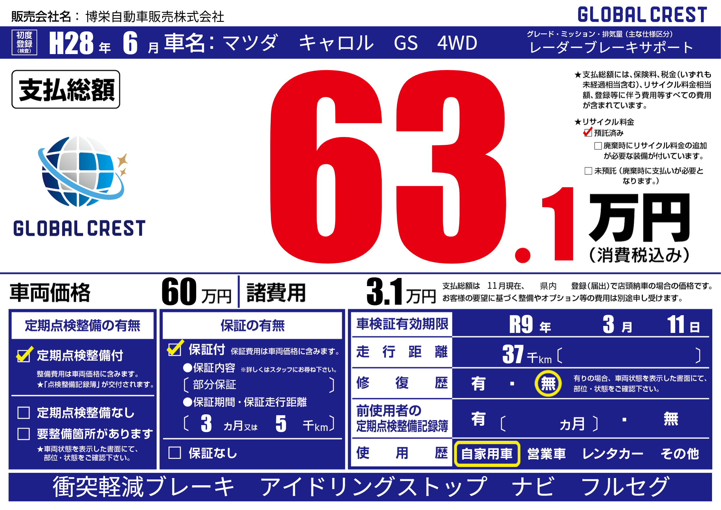 | 車検制限 | R9年 3月 11日 | ||