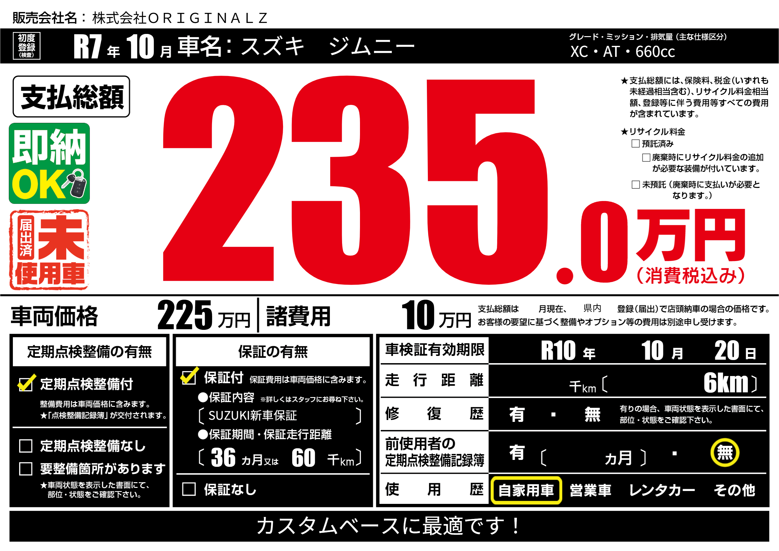 | 走行キロ | - | 初年度登録 | R7年10月 |