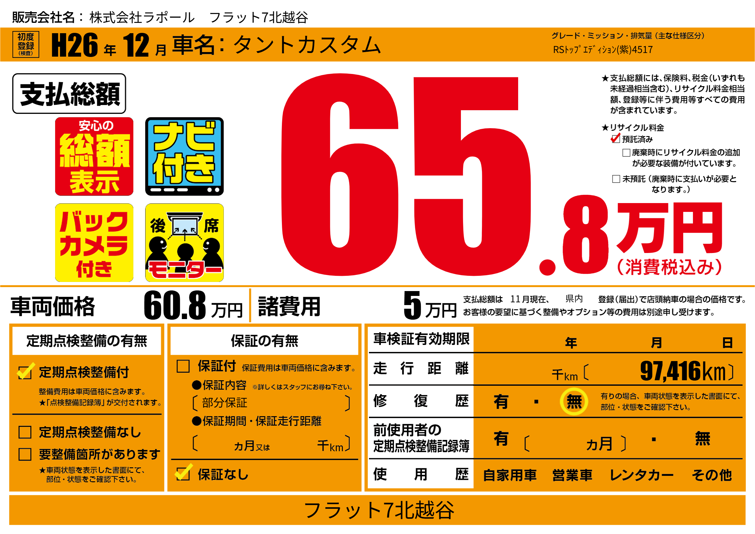 | 走行キロ | - | 初年度登録 | H26年12月 |