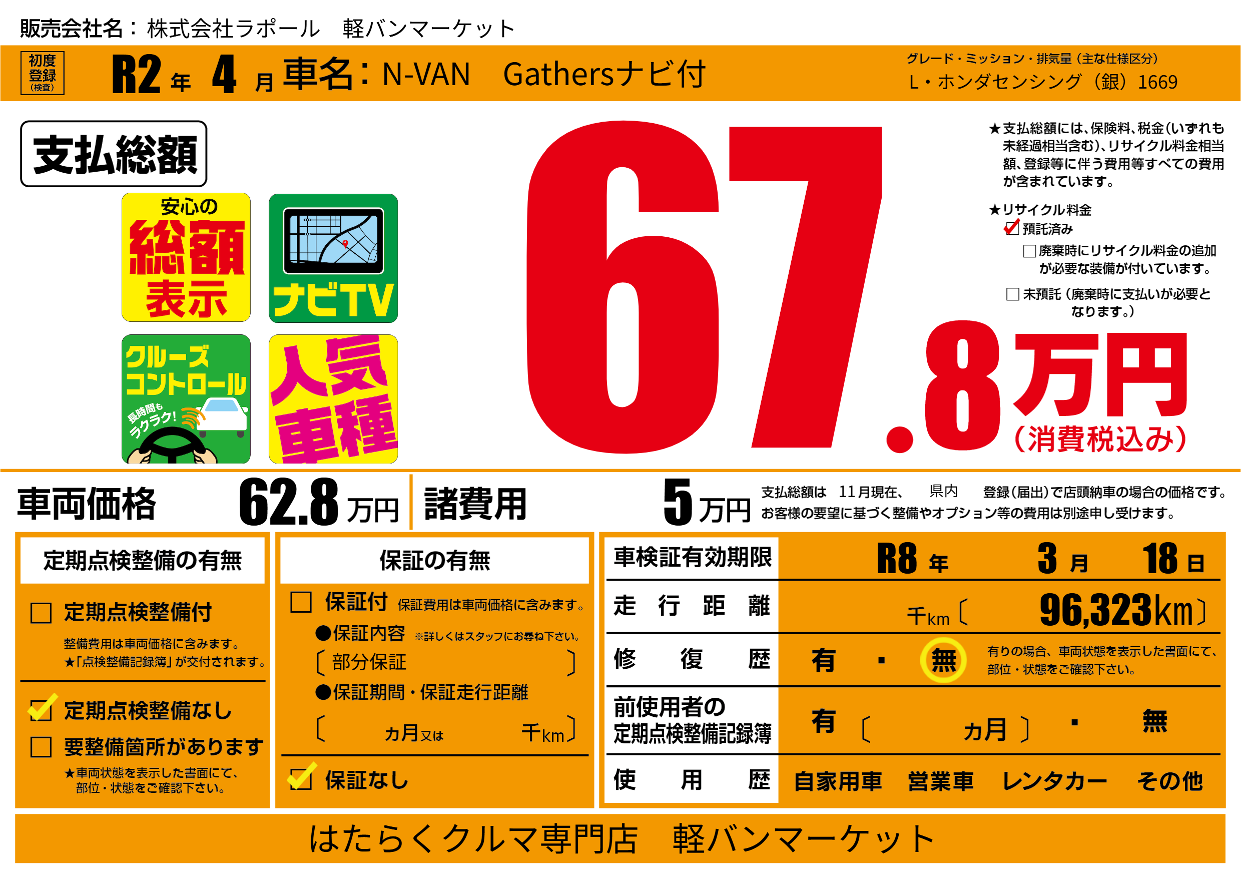 | 車名 | N-VAN Gathersナビ付 | グレード ミッション 排気量 |