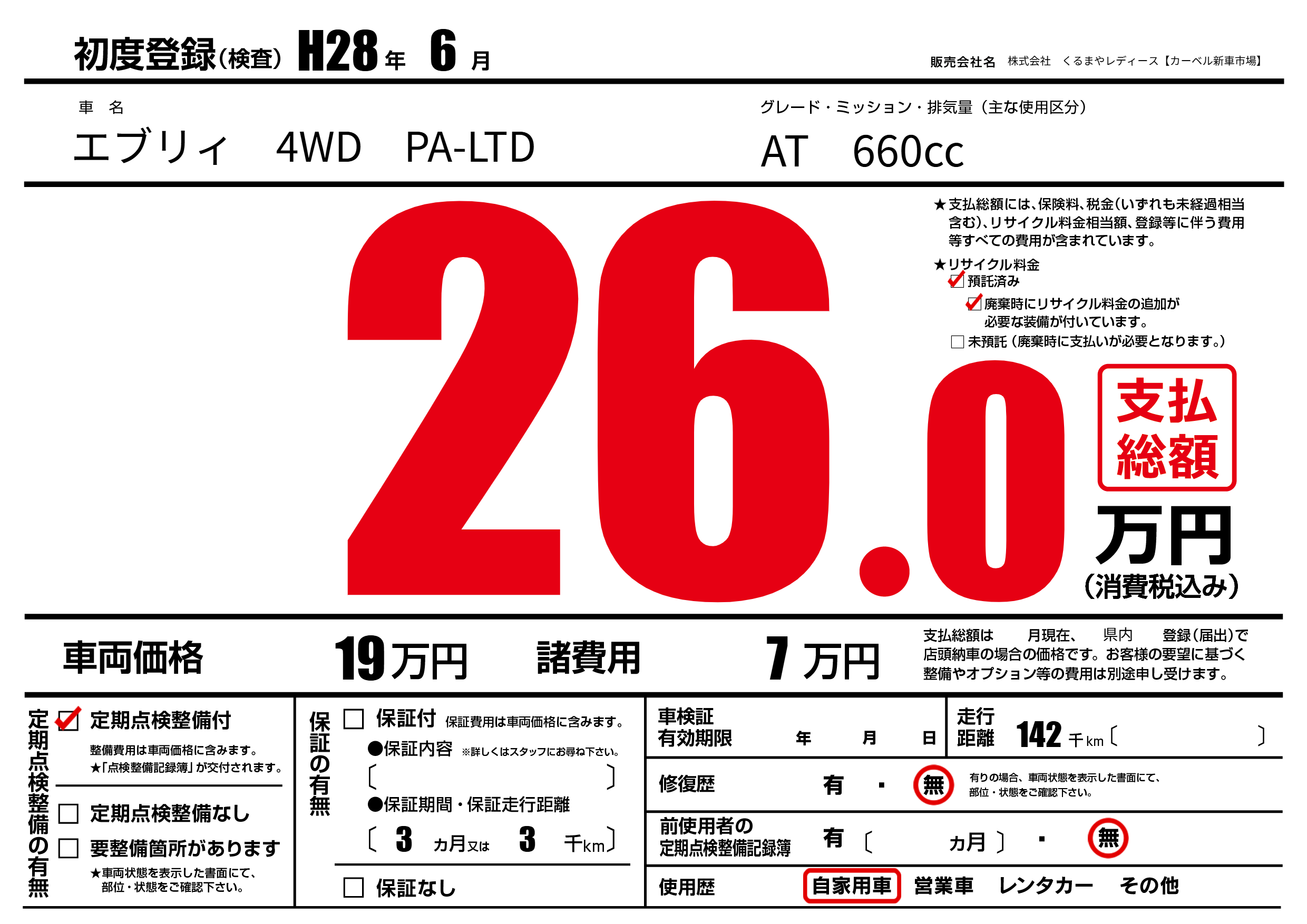 | 車名 | エブリィ 4WD PA-LTD | グレード ミッション 排気量 |