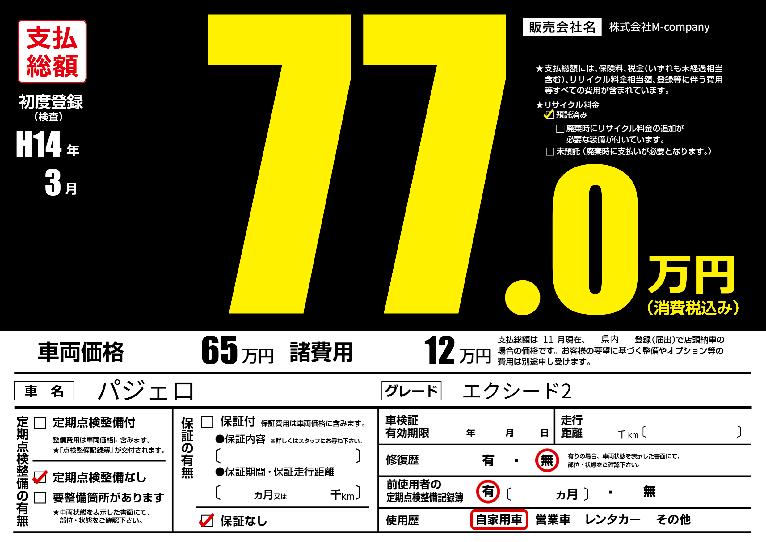 | 車名 | パジェロ | グレード ミッション 排気量 |