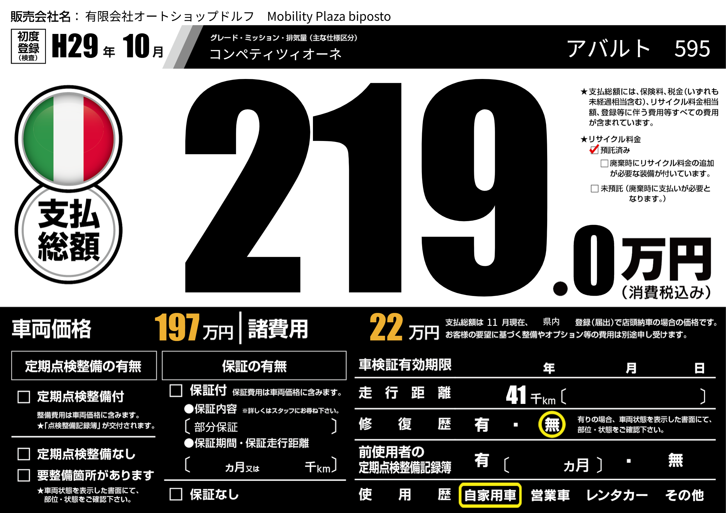 | 車名 | アバルト 595 | グレード ミッション 排気量 |