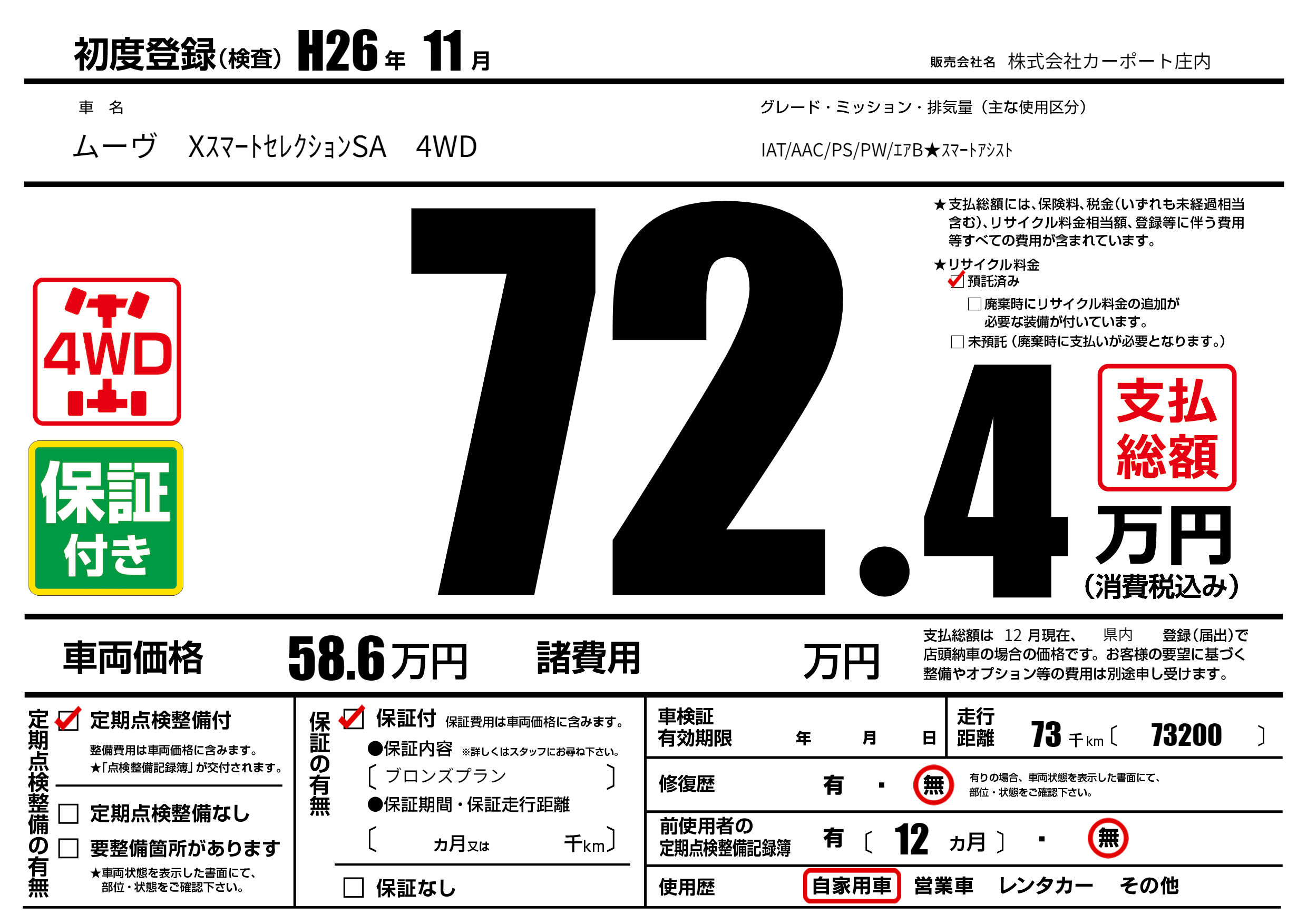 | 車名 | ムーヴ XスマートセレクションSA 4WD | グレード ミッション 排気量 |