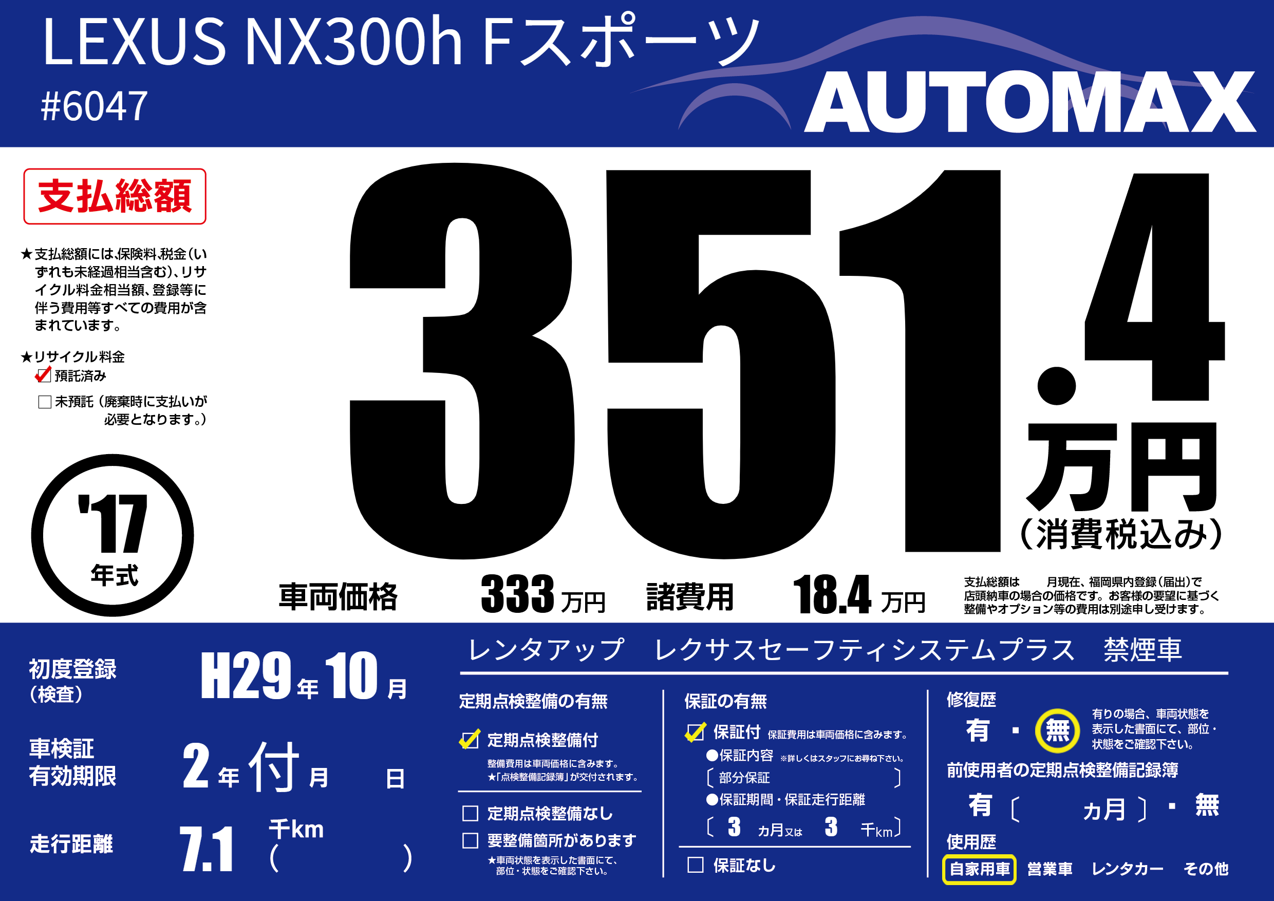 | 車名 | LEXUS NX300h Fスポーツ | グレード ミッション 排気量 |
