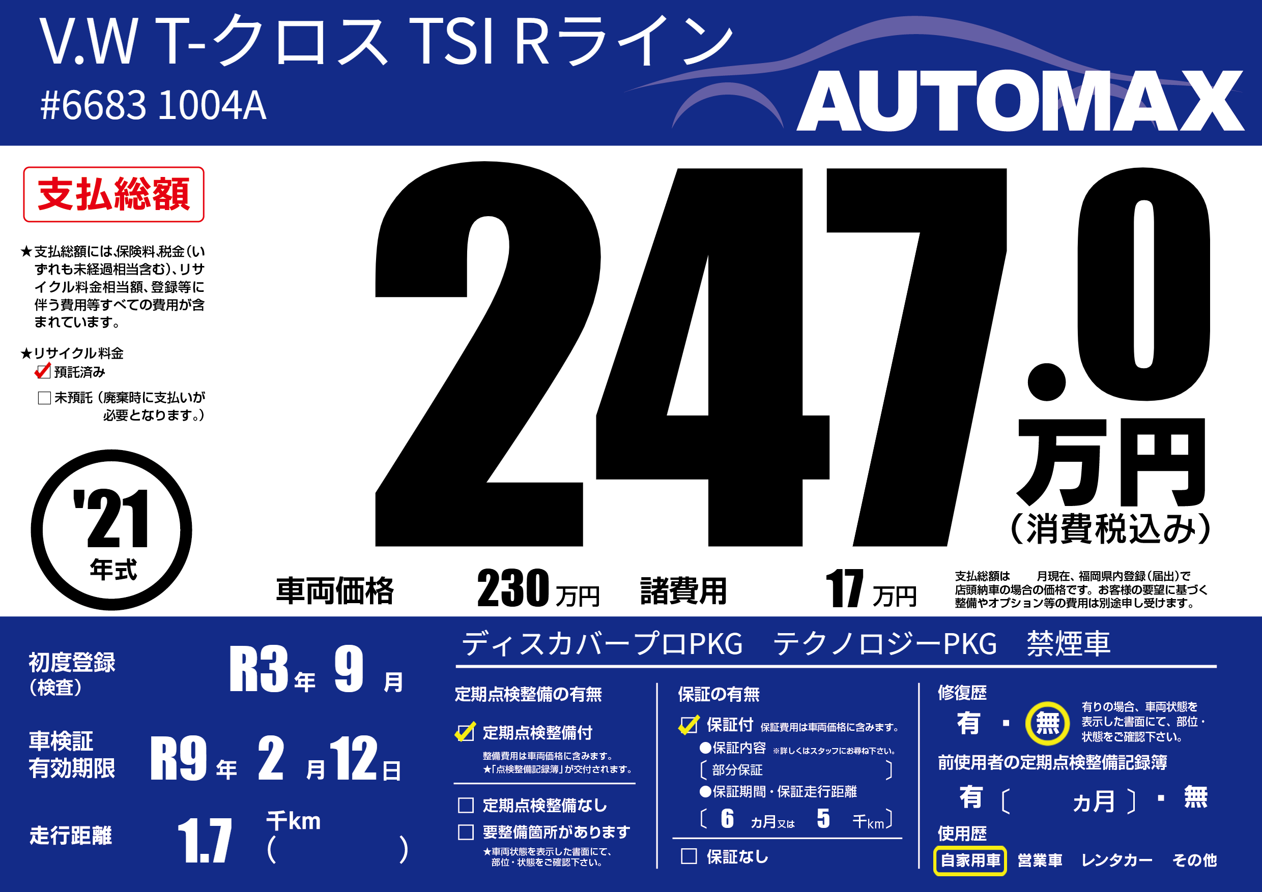 | 車名 | V.W T-クロス TSI Rライン | グレード ミッション 排気量 |