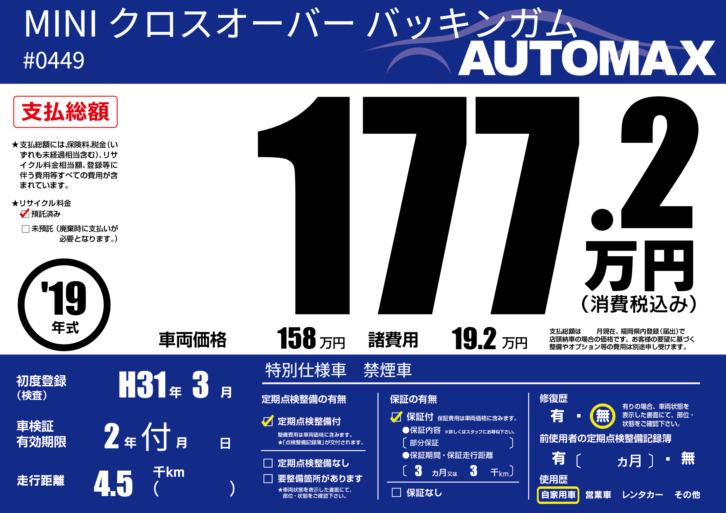 | 車名 | MINI クロスオーバー バッキンガム | グレード ミッション 排気量 |