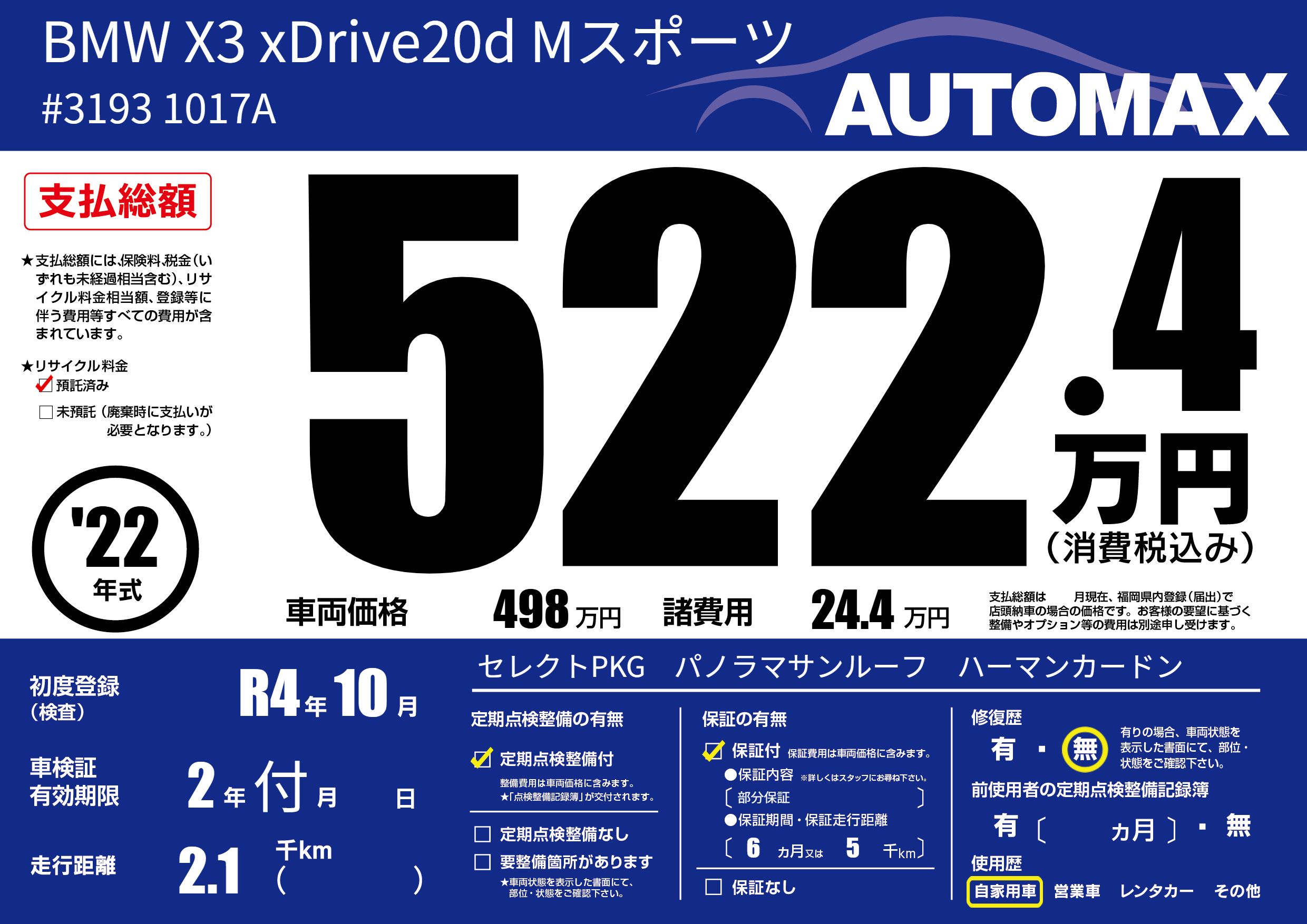 | 車名 | BMW X3 xDrive20d Mスポーツ | グレード ミッション 排気量 |