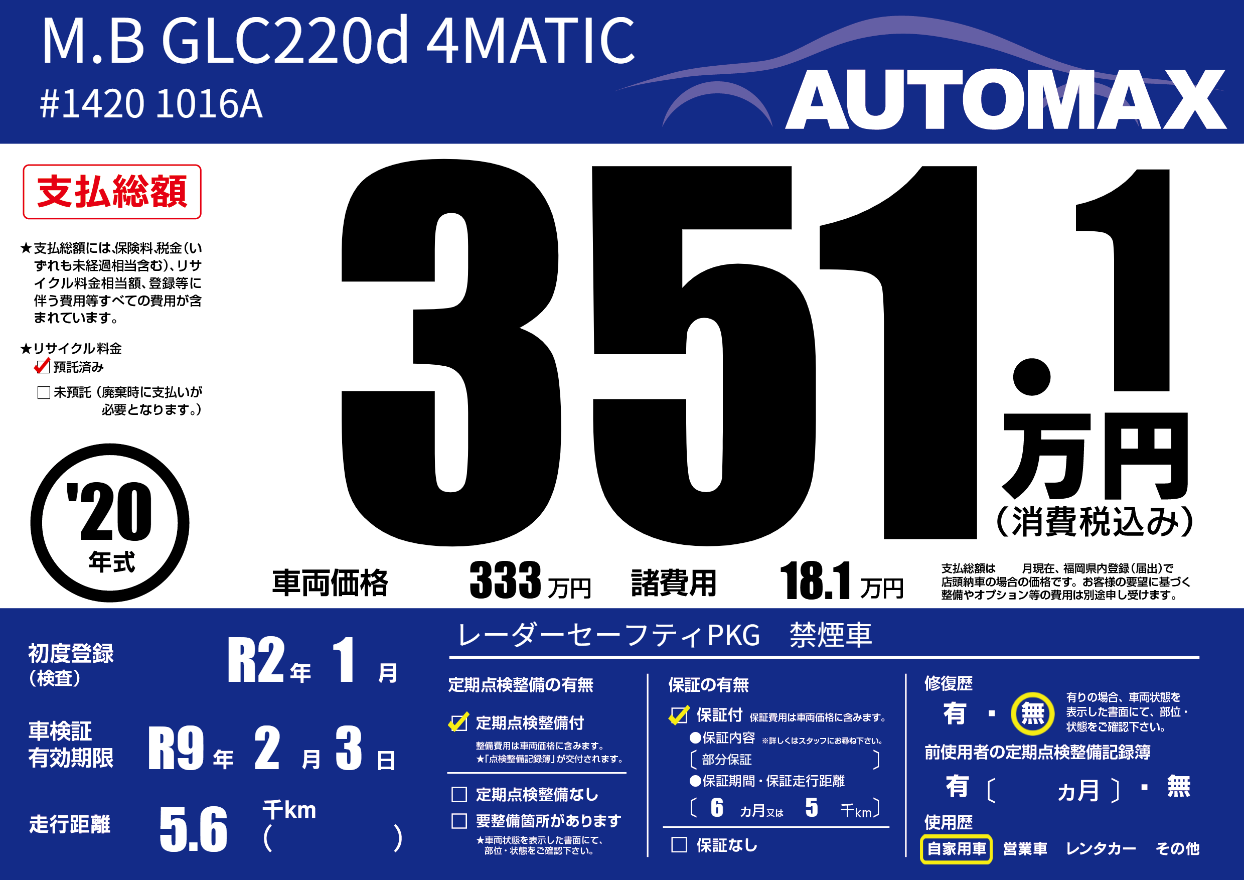 | 車名 | M.B GLC220d 4MATIC | グレード ミッション 排気量 |