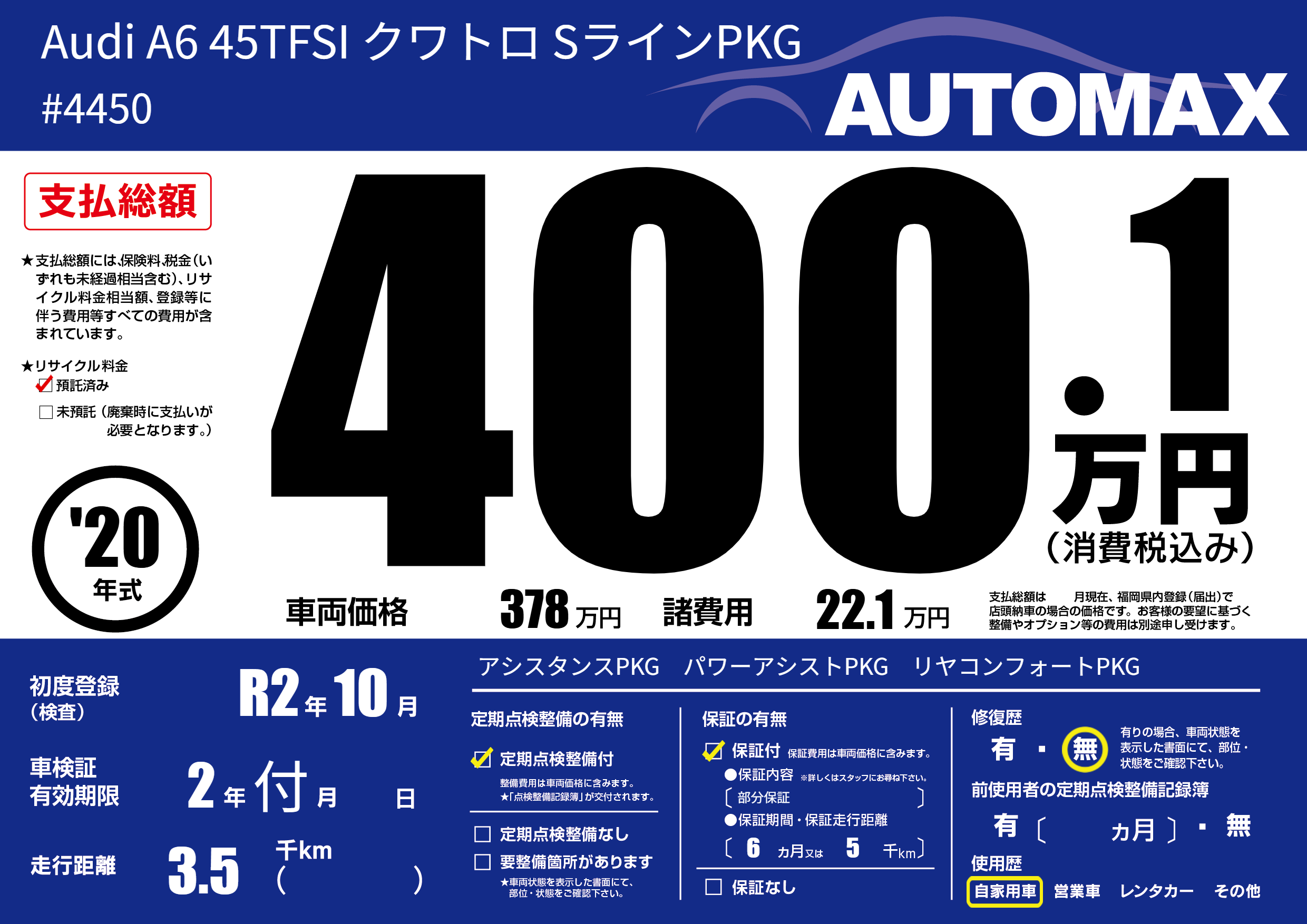 | 車名 | Audi A6 45TFSI クワトロ SラインPKG | グレード ミッション 排気量 |