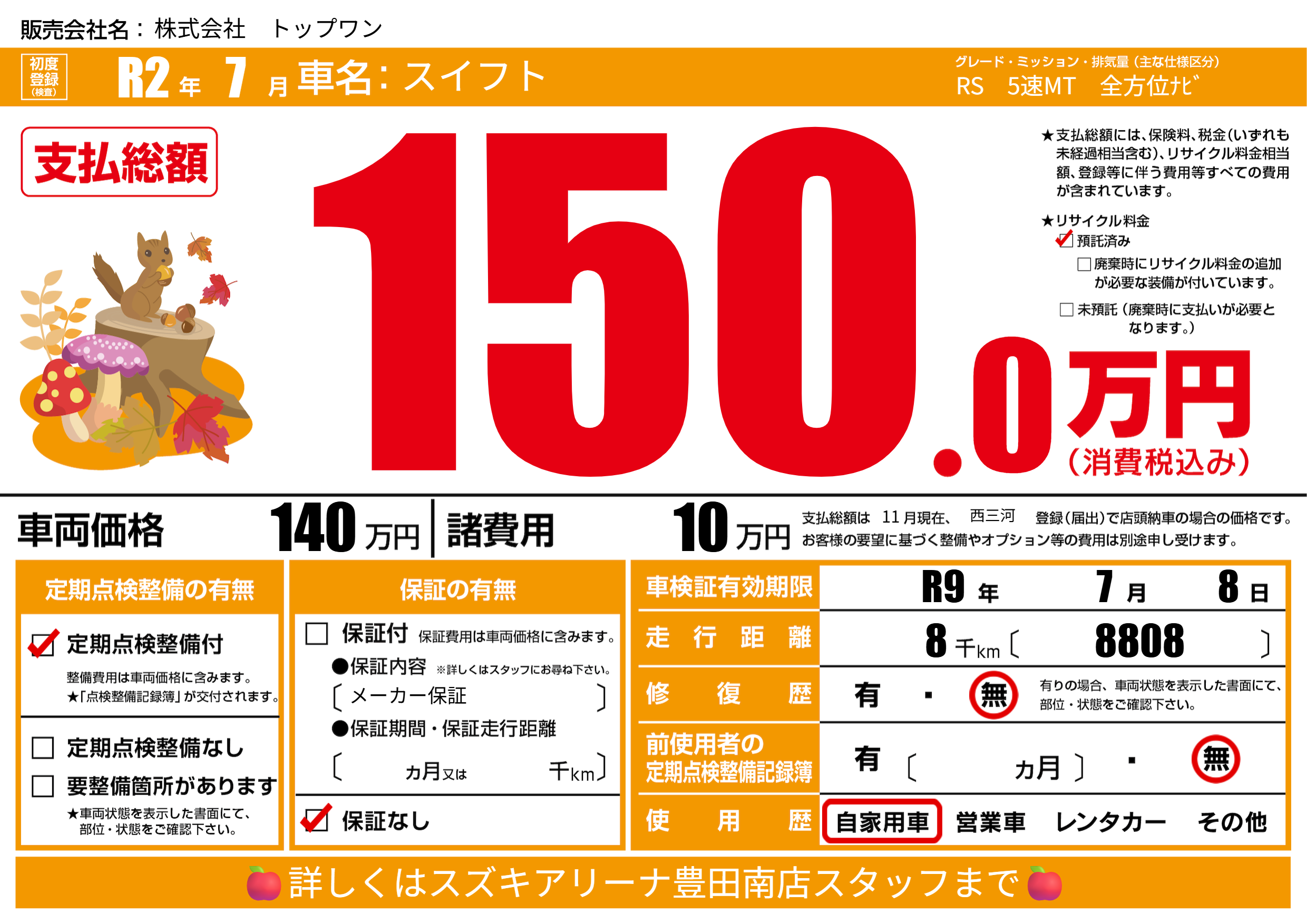 | 走行キロ | 0.8万km | 初年度登録 | R2年7月 |