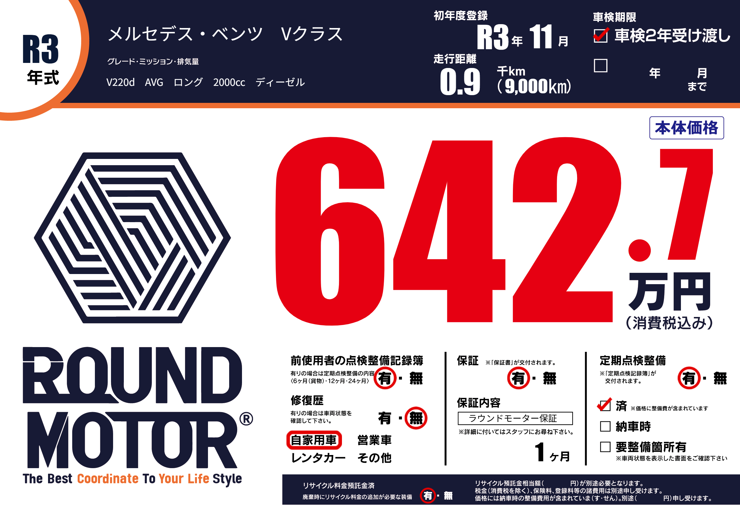 | 車名 | メルセデス・ベンツ Vクラス | グレード ミッション 排気量 |